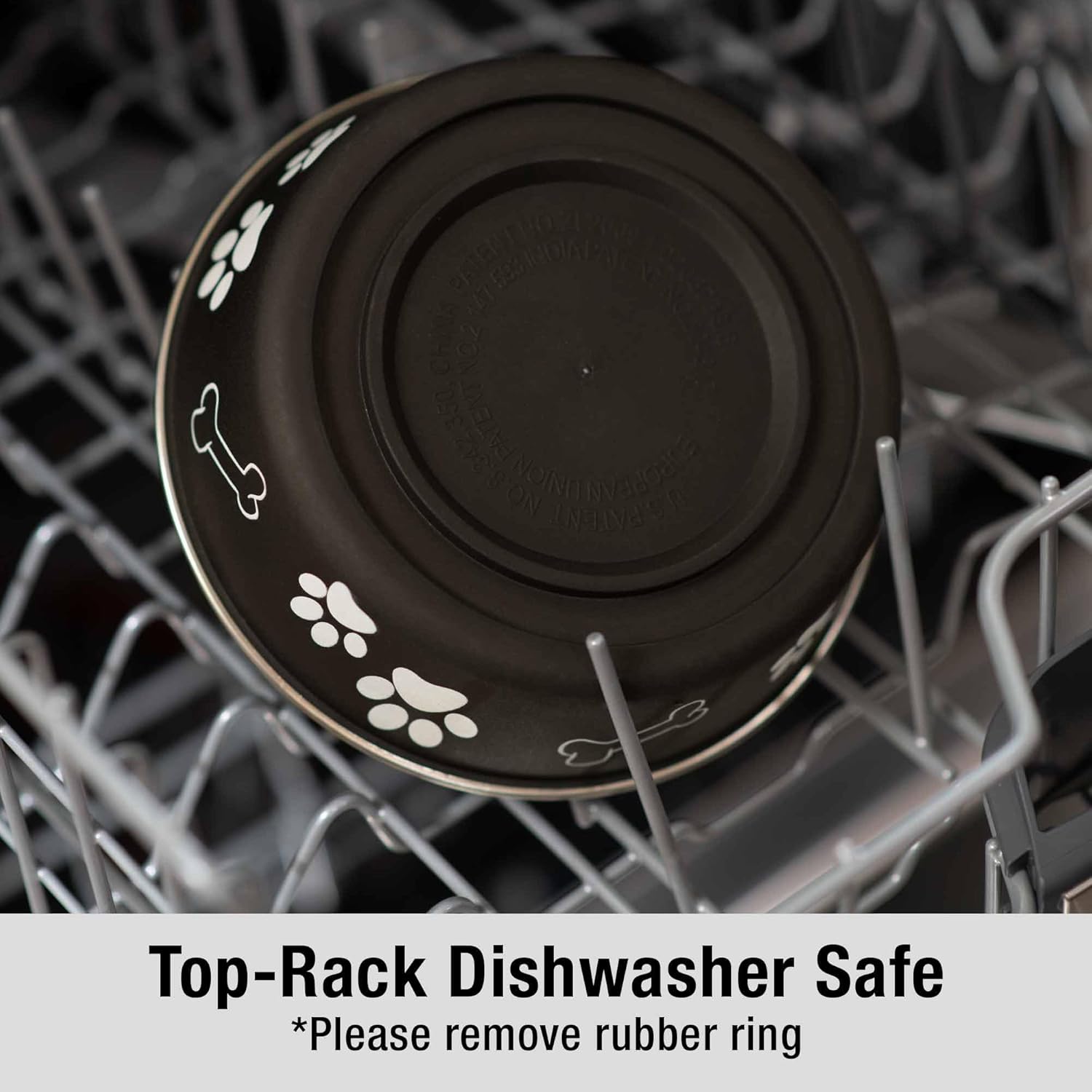 - Veterinarian recommended stainless steel interior. Removable soy-based rubber ring prevents spills and reduces noise. Dishwasher safe; remove rubber ring before washing. Available in five colors and 4 sizes to fit any decor1-Quart bowl