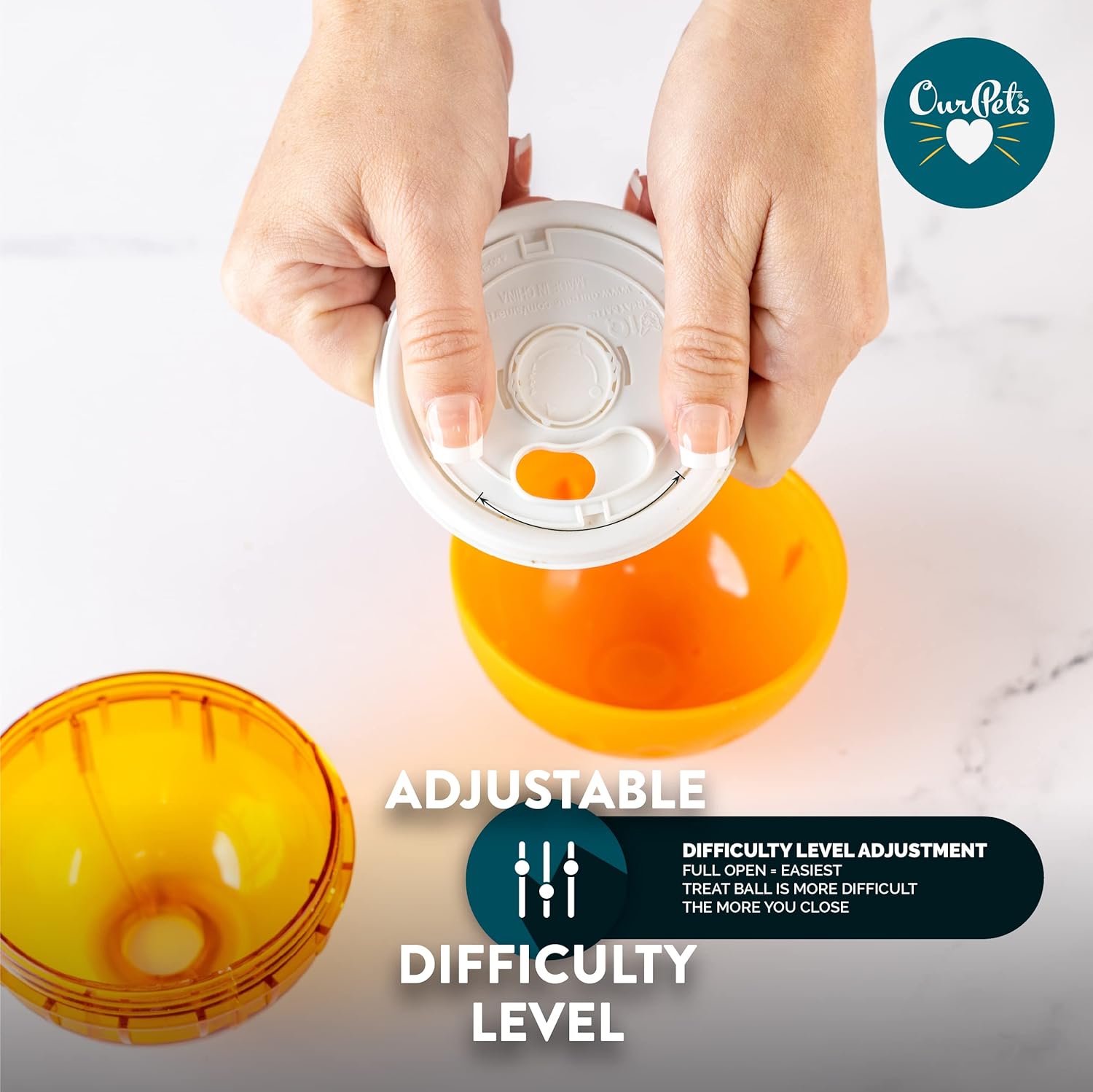 - CUSTOMIZABLE IQ TREAT BALL: Your furry friend gets smarter as they play with this interactive dog toy ball, learning how to roll the ball to get treats to fall out. Adjust the desired difficulty level using the ball’s adjustable interior disc.