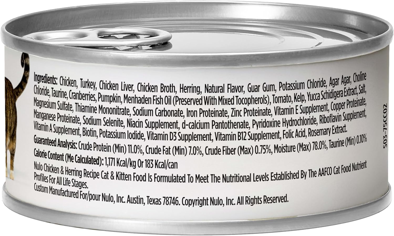 - CHICKEN & HERRING RECIPE -Nulo Freestyle Cat & Kitten Wet Pate Canned Cat Food features our proprietary blend of grain-free proteins and vitamins ideal for cats with diagnosed grain allergies and sensitivities. Pack of 24, 5.5 Oz each.