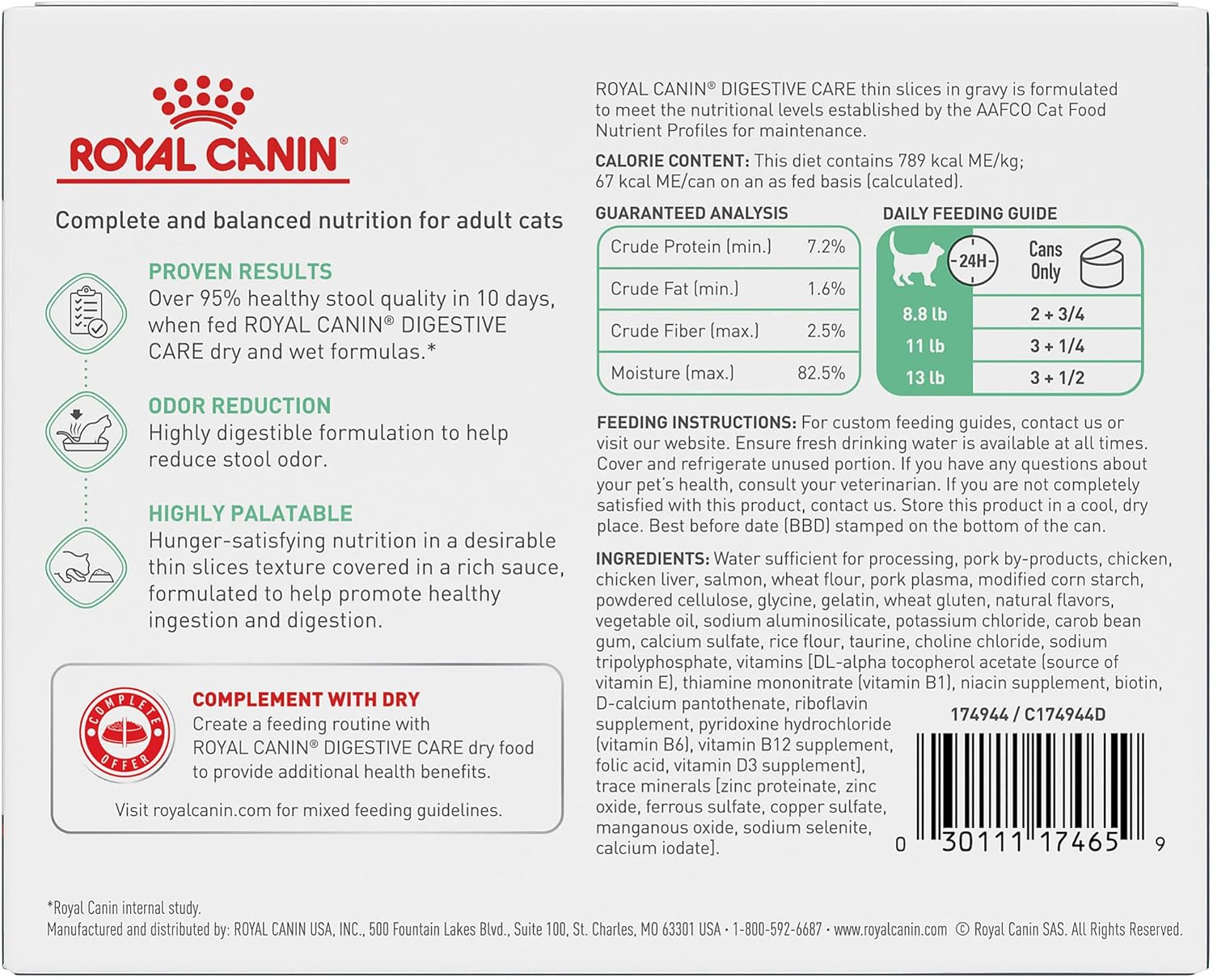 - FOR CATS WITH SENSITIVE STOMACHS: Royal Canin Digestive Care Thin Slices in Gravy Wet Cat Food is formulated for cats 1 year and older with sensitive stomachs