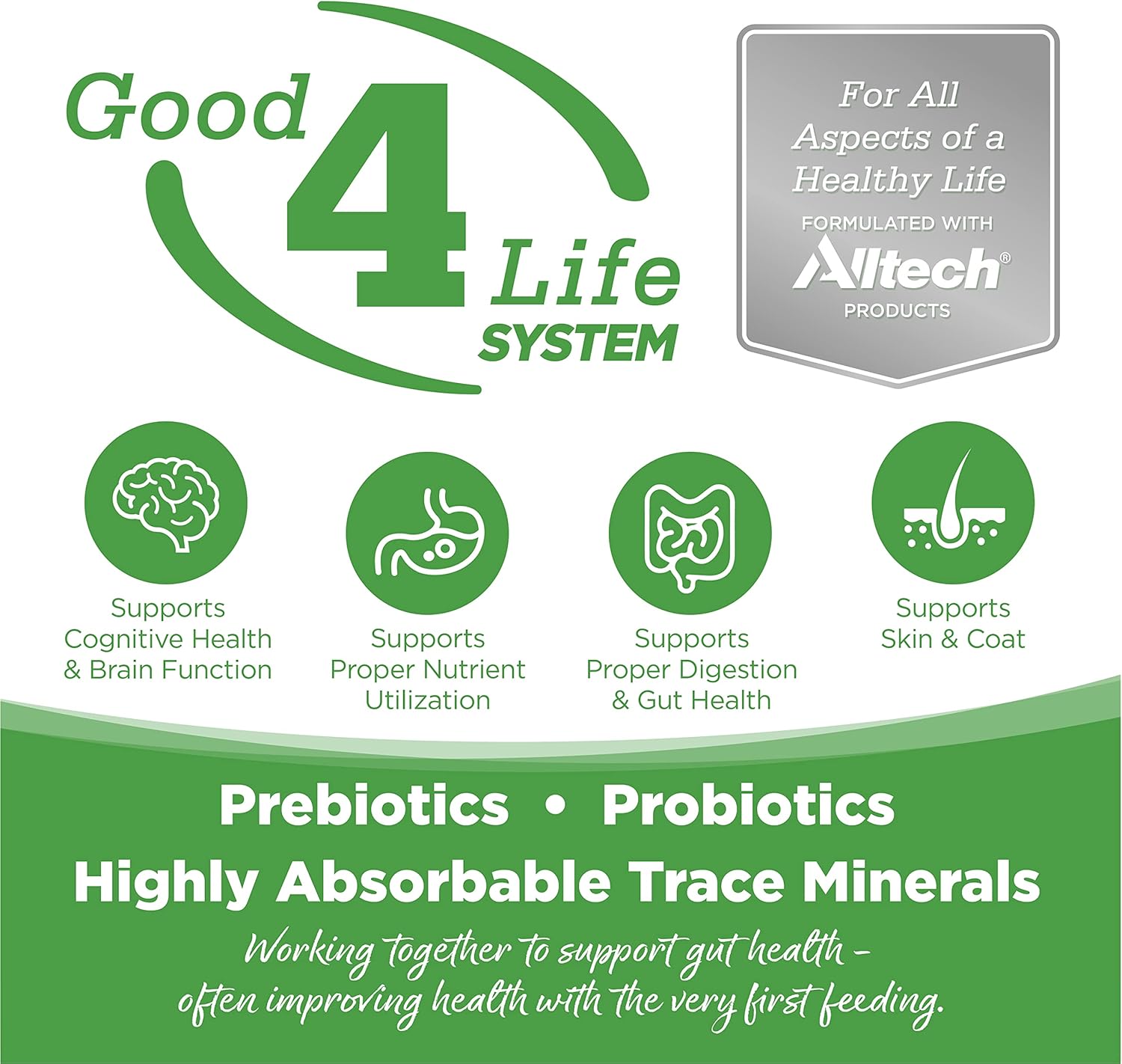 - Our revolutionary supplement system, good 4 life, Includes 4 key ingredients. They work together to condition, repair and promote gut health in all animals-often improving health with the first feeding.