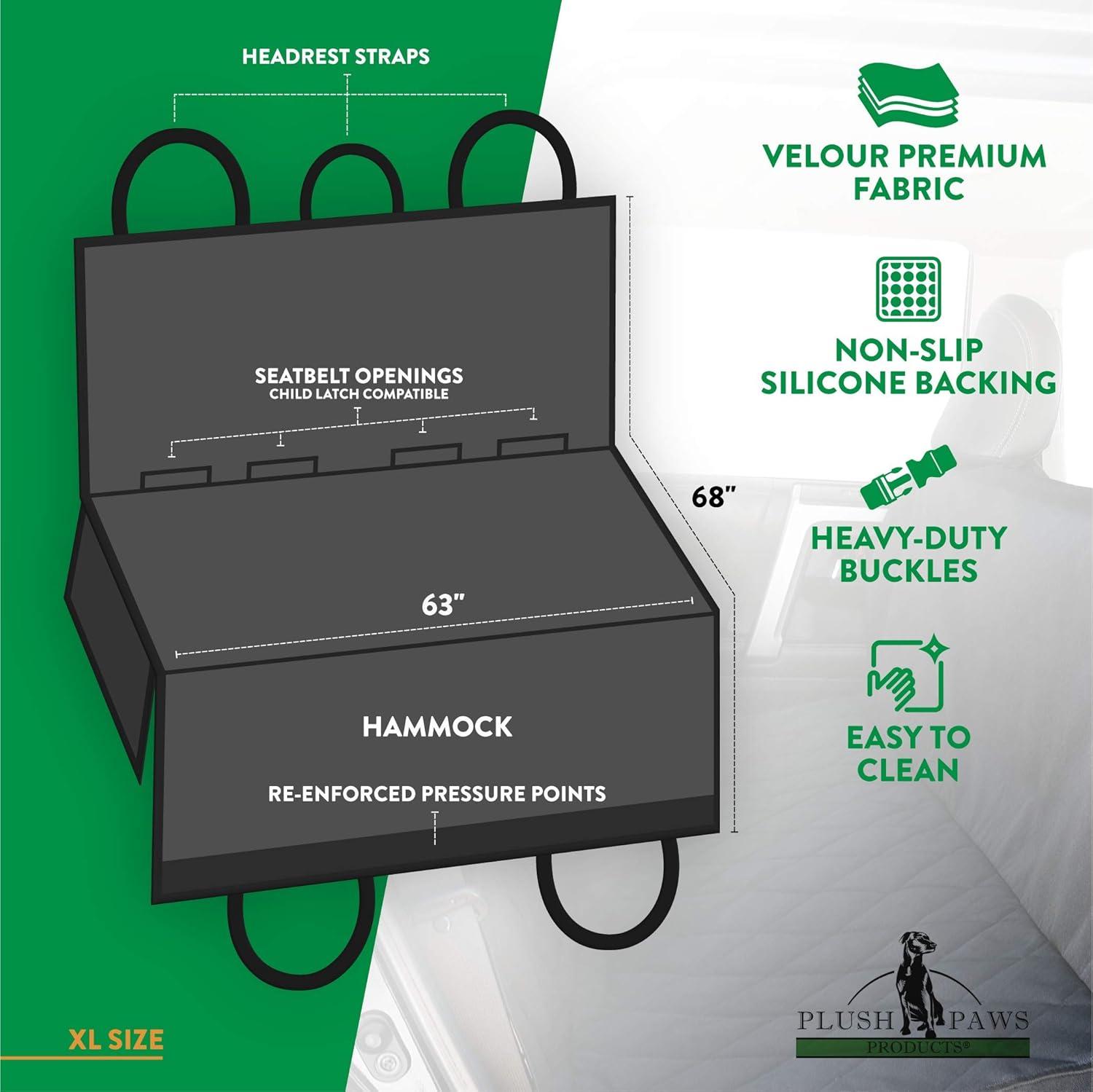 - πππ¦π¬ π§π’ ππ‘π¦π§πππ: This back seat car cover comes in various sizes, REGULAR - 55''W X 60''L / EXTRA LARGE - 63''W X 68''L / BOTH HAVE - 9'' X 18'' SIDE FLAPS and DETACHABLE HAMMOCK. This elastic skirt and adjustable back and headrest straps provide a seamless clean look and snug fit. Buckle the dog car seat protector to your back seat using the adjustable back strap and insert the seat anchors to secure the cover in place. The headrest strap fits most vehicles.