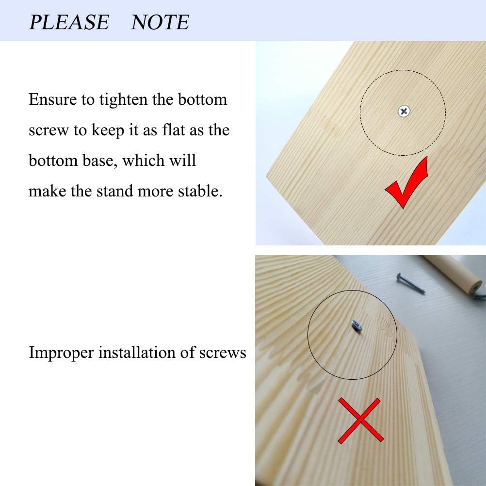 - KINDLY TIPS: 1.Wooden products in transit may lead to small amount of wood chips, it is recommended to wipe before installation. 2.Ensure to tighten the bottom screw to keep it as flat as the bottom base, which will make the stand more stable.