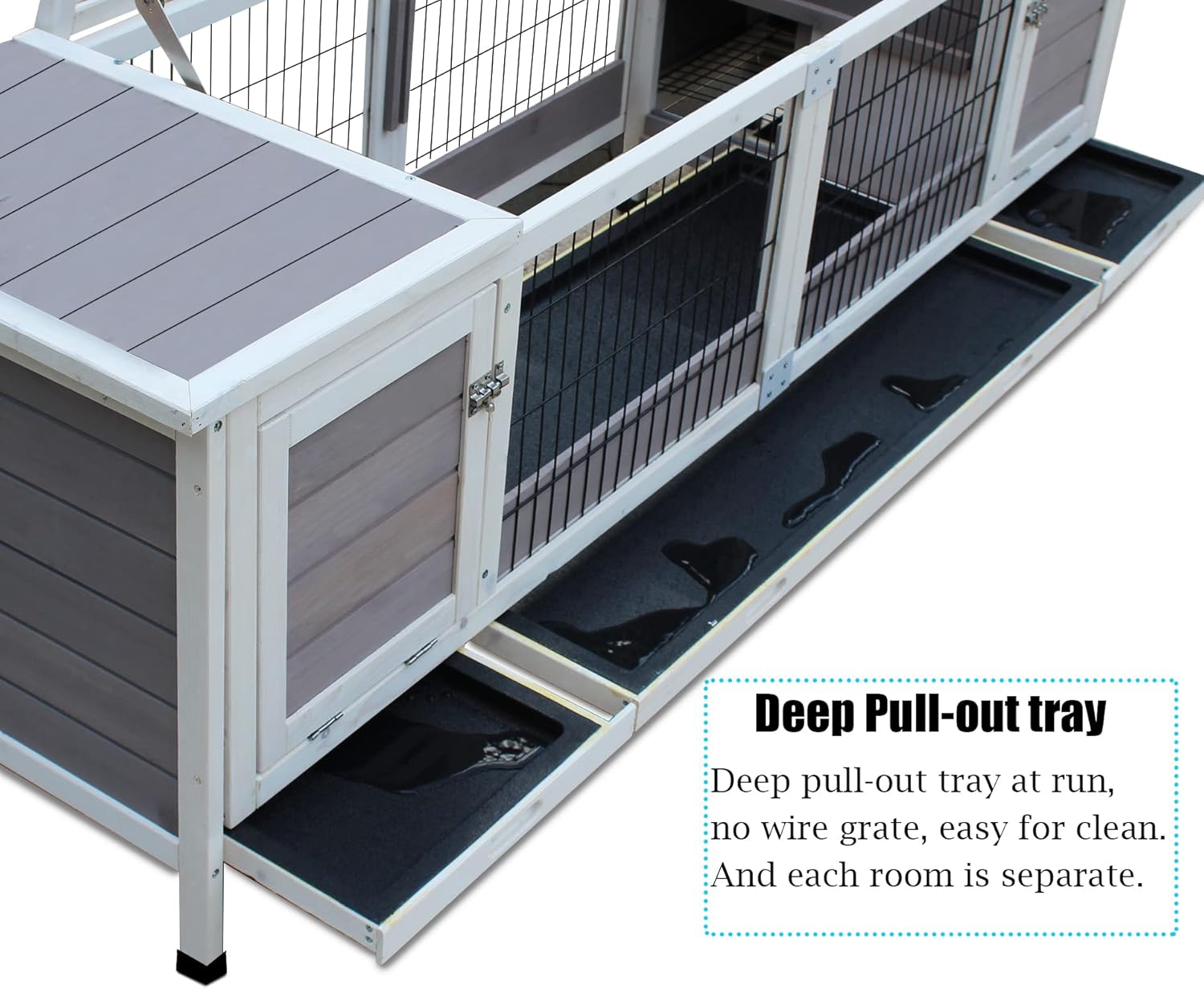 - Easy to clean: It's easy to gain access to the inside by opening the side doors and the top wire for daily cleaning. Your pets can stay in the wood hut with the sliding door locked up while you are cleaning the pull out tray