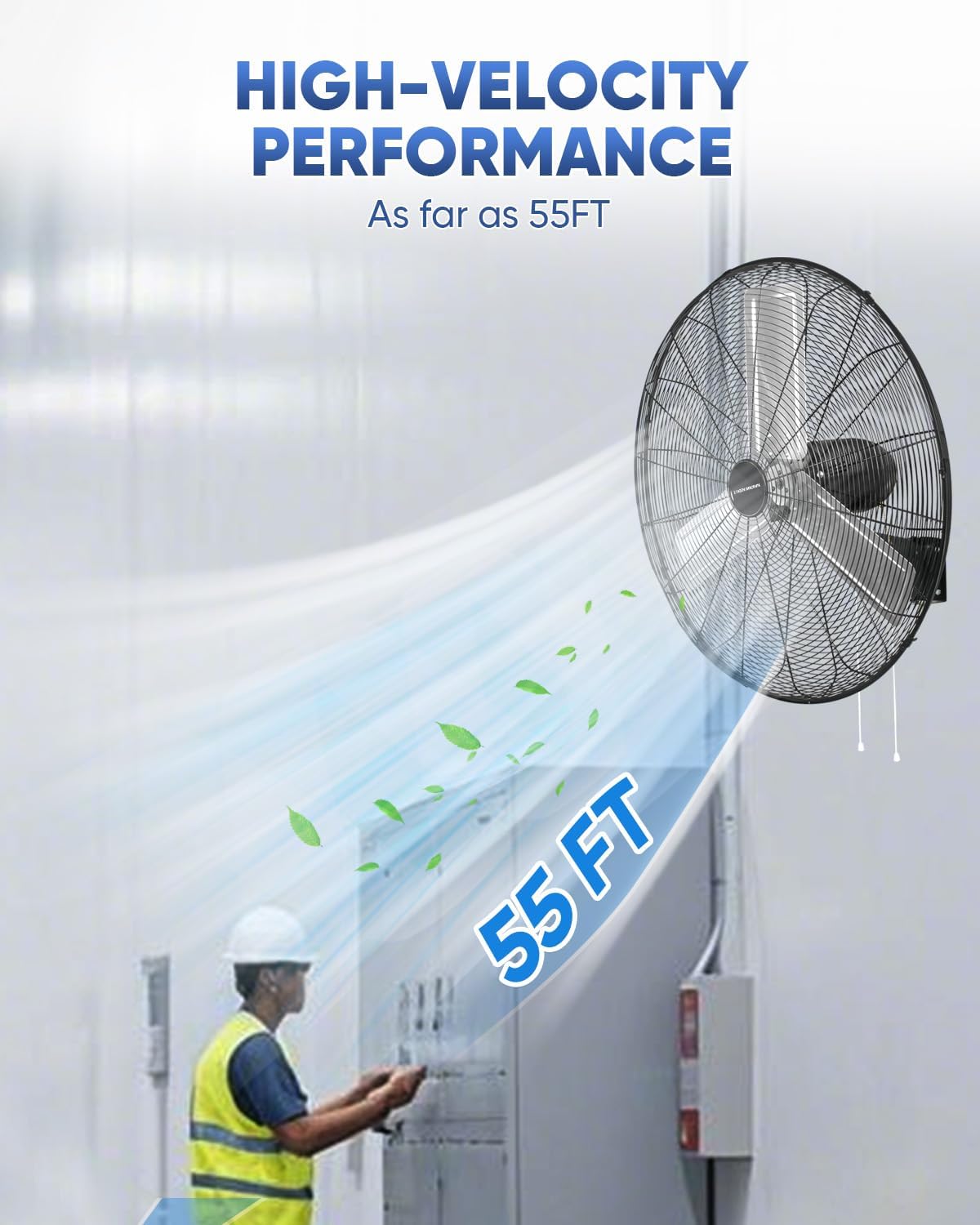 - Superior Airflow Performance. This high-velocity fan delivers up to 7497 CFM on high speed with 2-speed settings. Featuring 90° oscillation and 60° vertical tilt, it ensures efficient cooling and wide air circulation for large spaces.