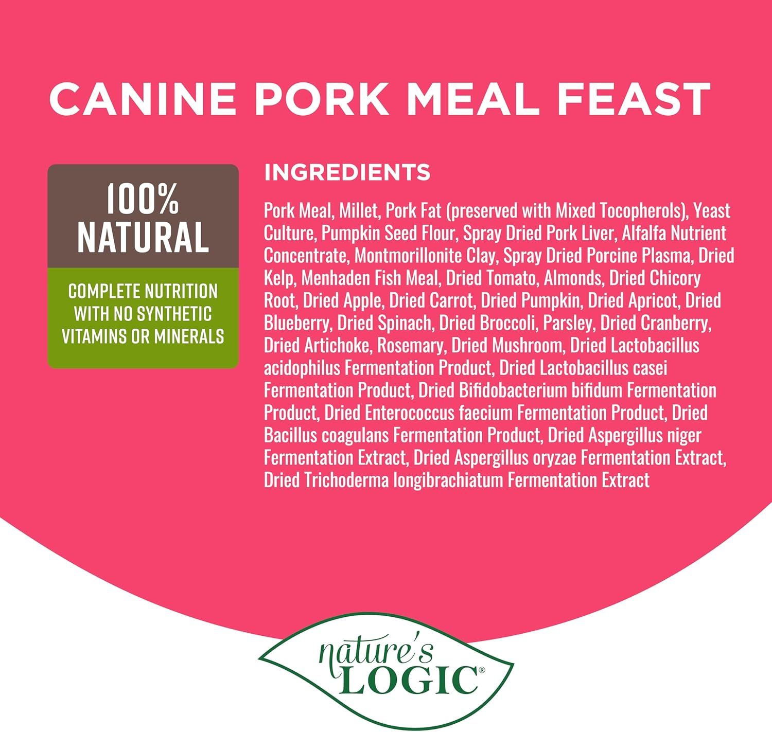 NATURE'S LOGIC Dry Dog Food - 100% Natural - No Synthetics - for All Ages, Sizes, Breeds - Free from Common Allergens, High Protein - Pork Meal Feast, 13lbs