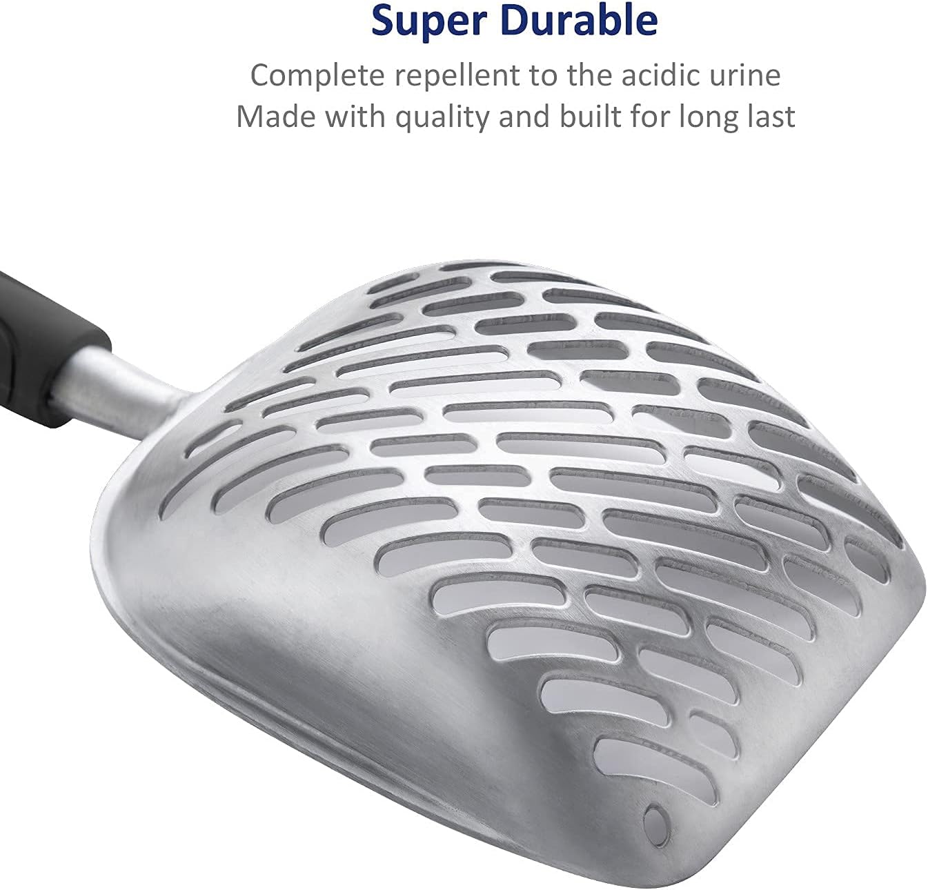 - [Features]: Deep Shovel Sifter was carefully developed by cat owners, WePet made this scooper with heavy duty quality, it’s durable, aluminum alloy body. The body is waterproof and very easy to clean, rust-resistant and corrosion resistant. It’s highly recommended by cat lovers for everyday use.