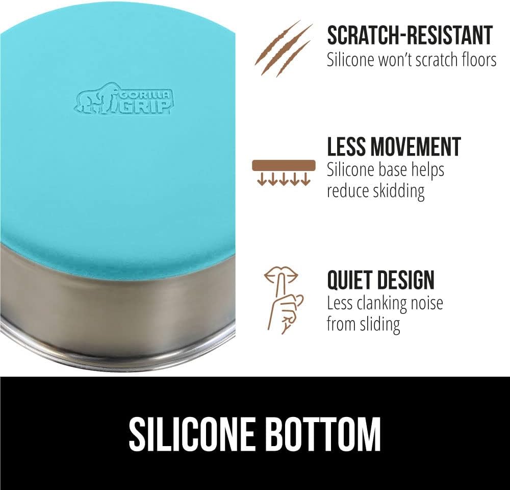 - SILICONE BOTTOM: the Gorilla Grip bowl is constructed from durable silicone that helps keep the bowl steady and won’t scratch your floors; while some over eager eaters may still be able to slide the bowls, the silicone will help prevent much movement; plus, it reduces the noise from clanking and sliding across wood, tile, and more