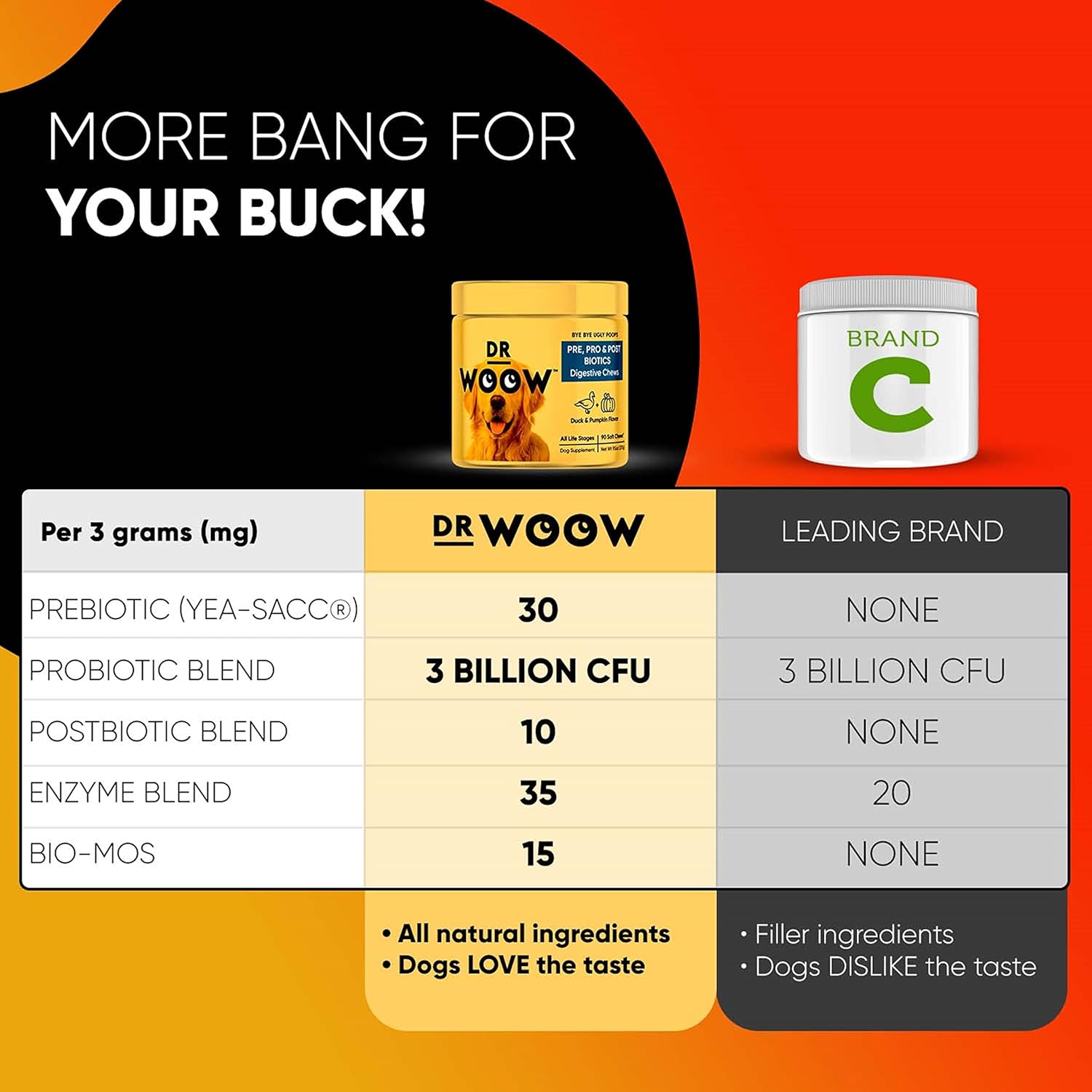 - GREAT TASTE PROBIOTIC CHEW FOR DOGS: our pre and probiotics for dogs are made so that your pet loves these dog supplements. These digestive probiotics for dogs have duck and pumpkin that make them taste great.