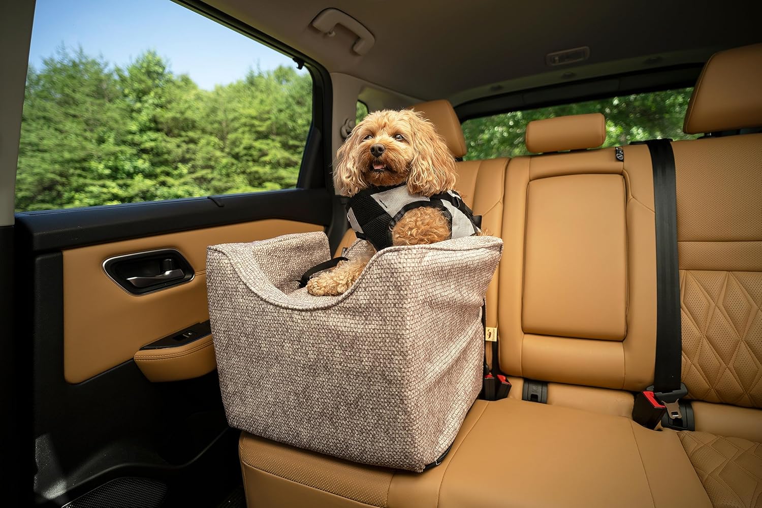 - Enjoy distraction-free driving with the Lookout Pet Car Seat. Designed for dog car safety, this dog car seat with harness clip and raised sidewalls keeps your pet securely contained and cozy, preventing roaming in the car and eliminating the need to hold them while driving. Installation is easy: loop the lap belt of your seatbelt through the channel in the back of the pet car seat; tighten for security. Fasten the included, adjustable harness strap to the lap belt and clip to your dog's harness.