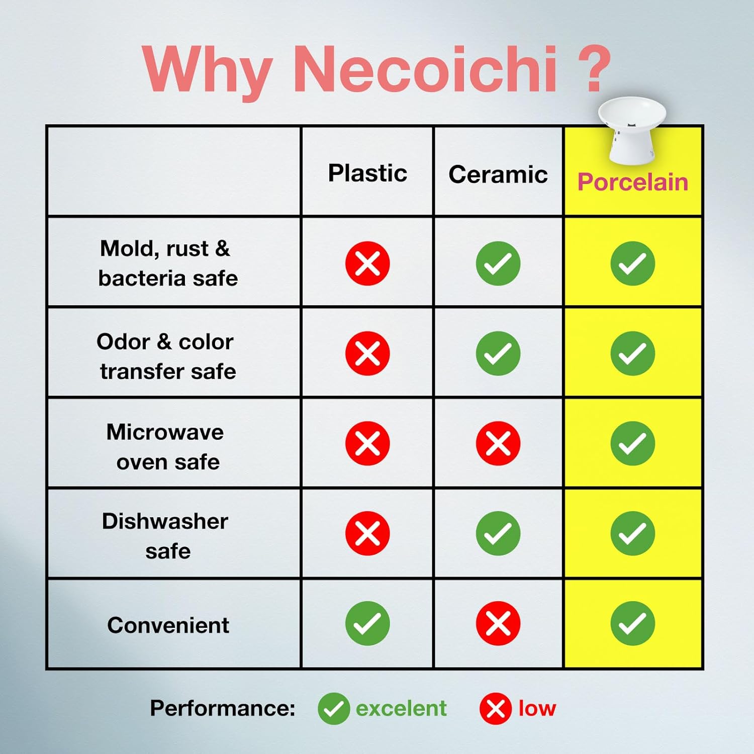 - Our first tilted bowl is joining Necoichi’s Raised Food Bowl lineup! Food stays centered, and the tilted lip makes it easier for your cat to eat without whisker or neck fatigue from the perfect height.