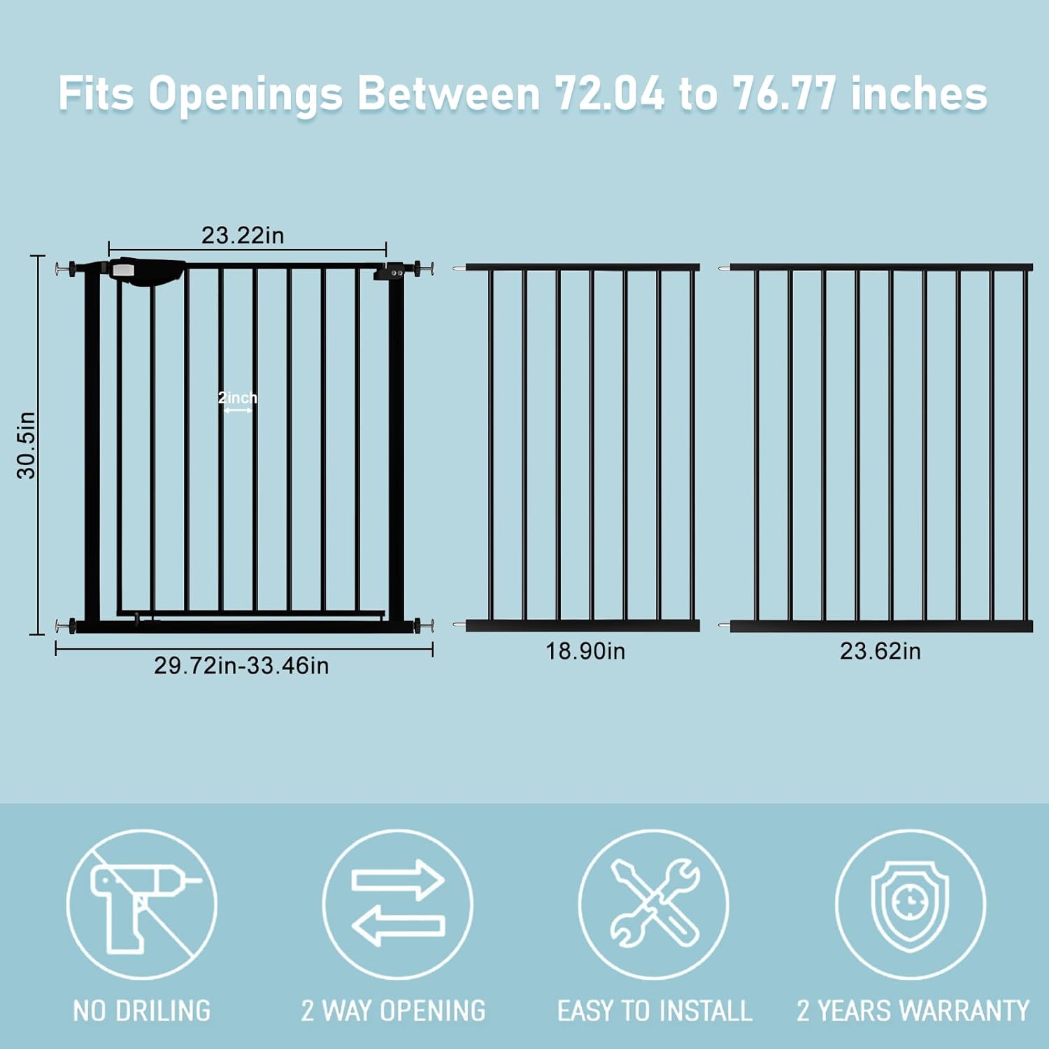 WAOWAO Triple Lock Baby Gate Extra Wide 72.04-76.77" Pressure Mounted Walk Through Swing Auto Close Safety Black Metal Dog Pet Puppy Cat for Stairs,Doorways,Kitchen