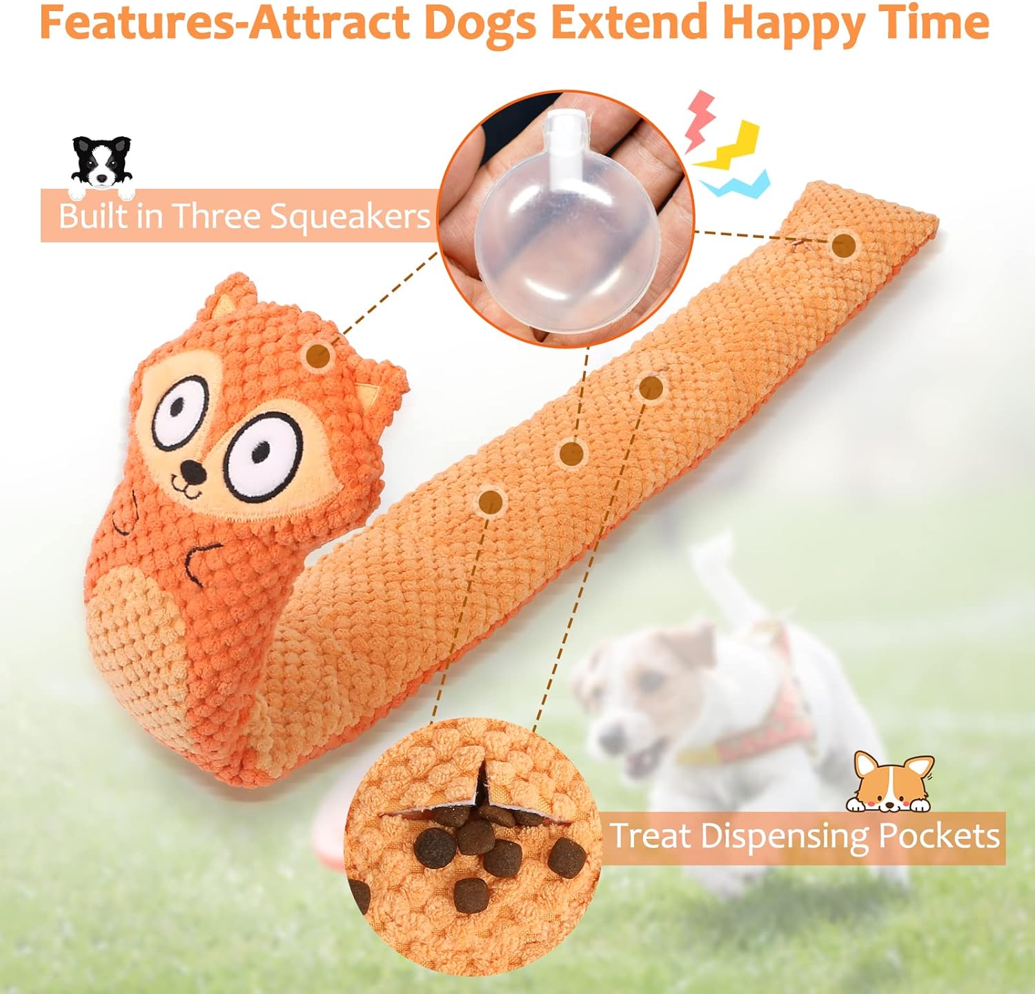 - Squeak Dog Toys :The cute toy has 3 built-in squeakers. All dogs like squeaking sounds, this will make them excited, release the pressure