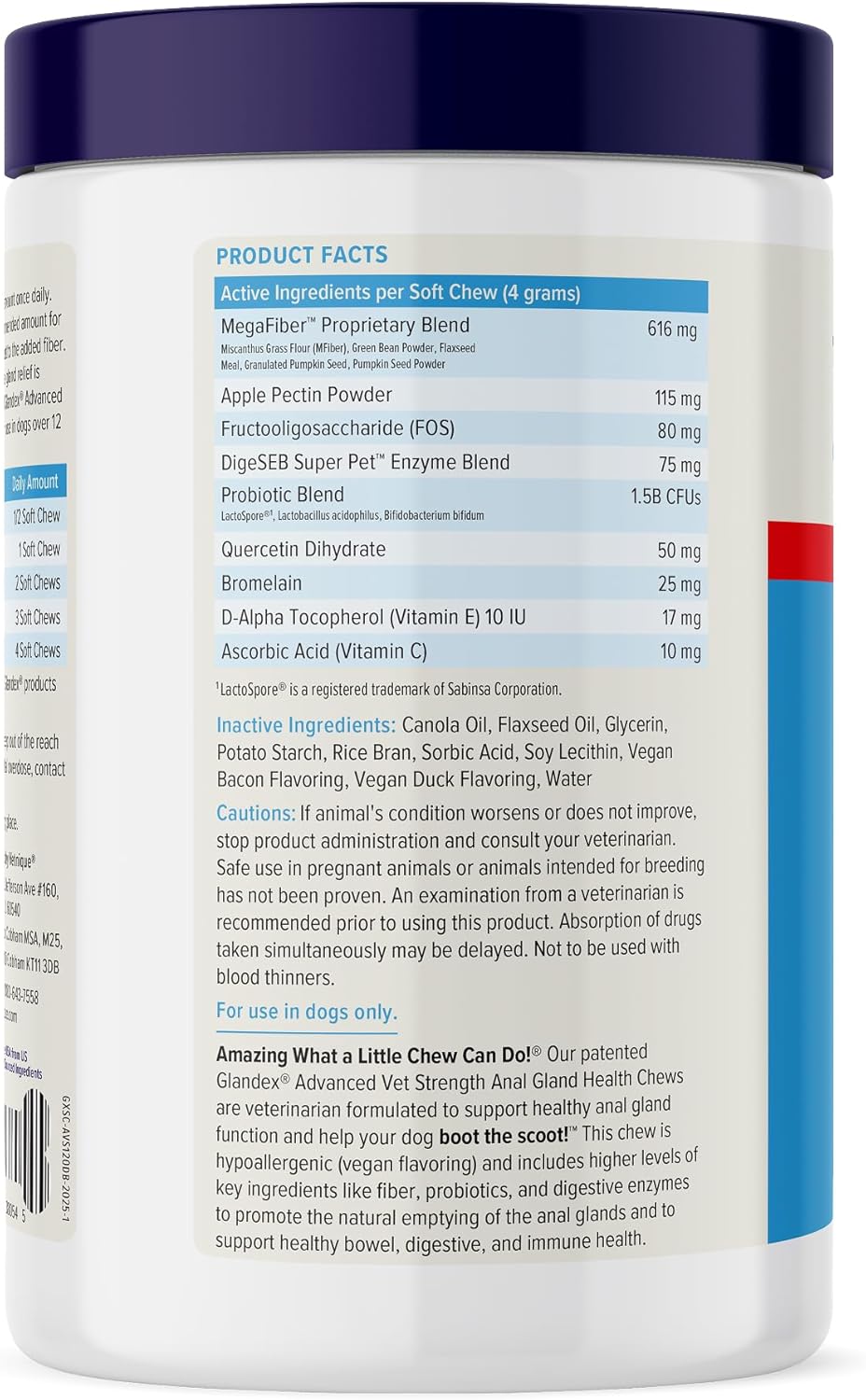 - VETERINARIAN RECOMMENDED: Glandex for Dogs Advanced Strength Soft Chews are the top recommended brand for digestive health and for healthy anal glands. Developed by vets to target underlying causes of anal gland problems.