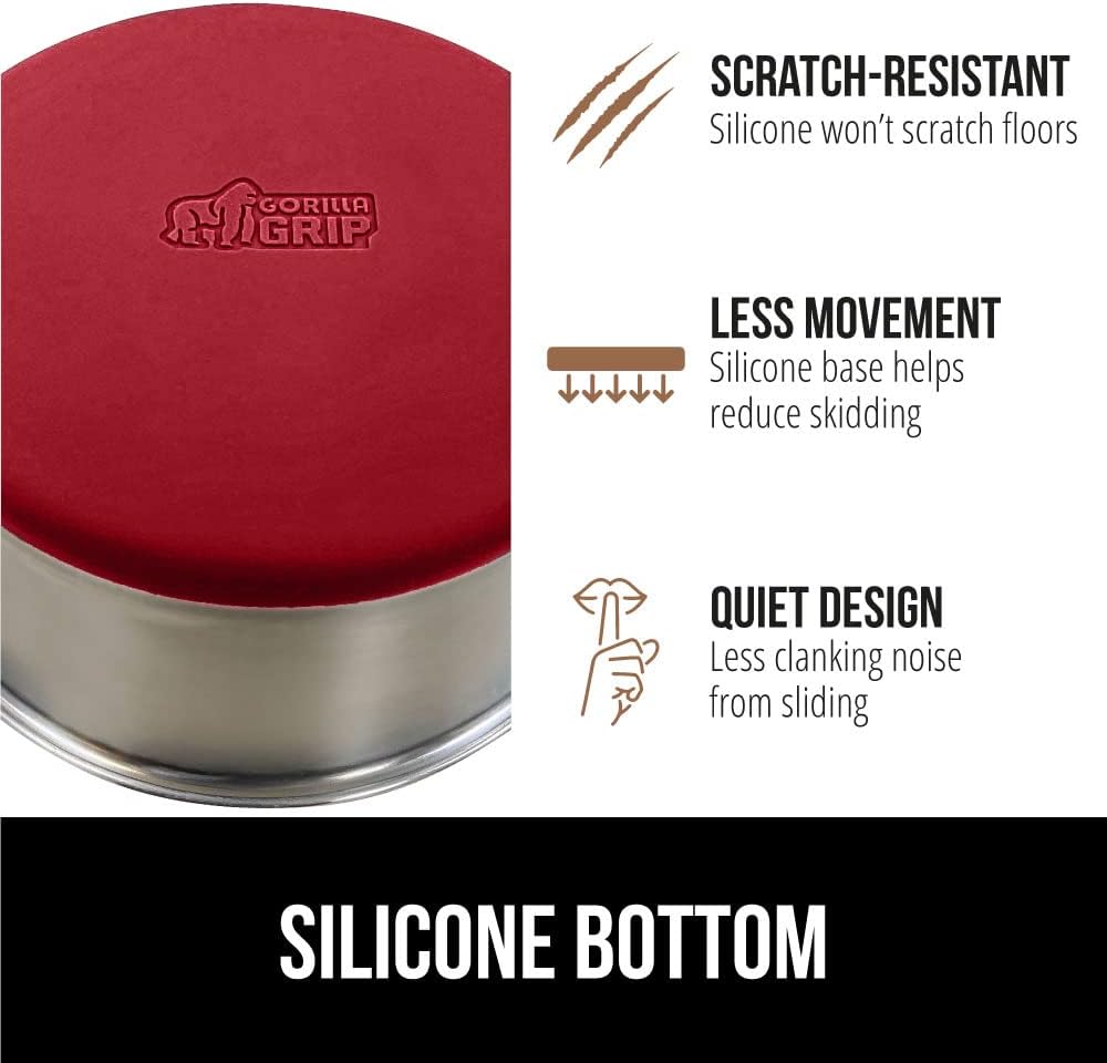 - SILICONE BOTTOM: the Gorilla Grip bowl is constructed from durable silicone that helps keep the bowl steady and won’t scratch your floors; while some over eager eaters may still be able to slide the bowls, the silicone will help prevent much movement; plus, it reduces the noise from clanking and sliding across wood, tile, and more