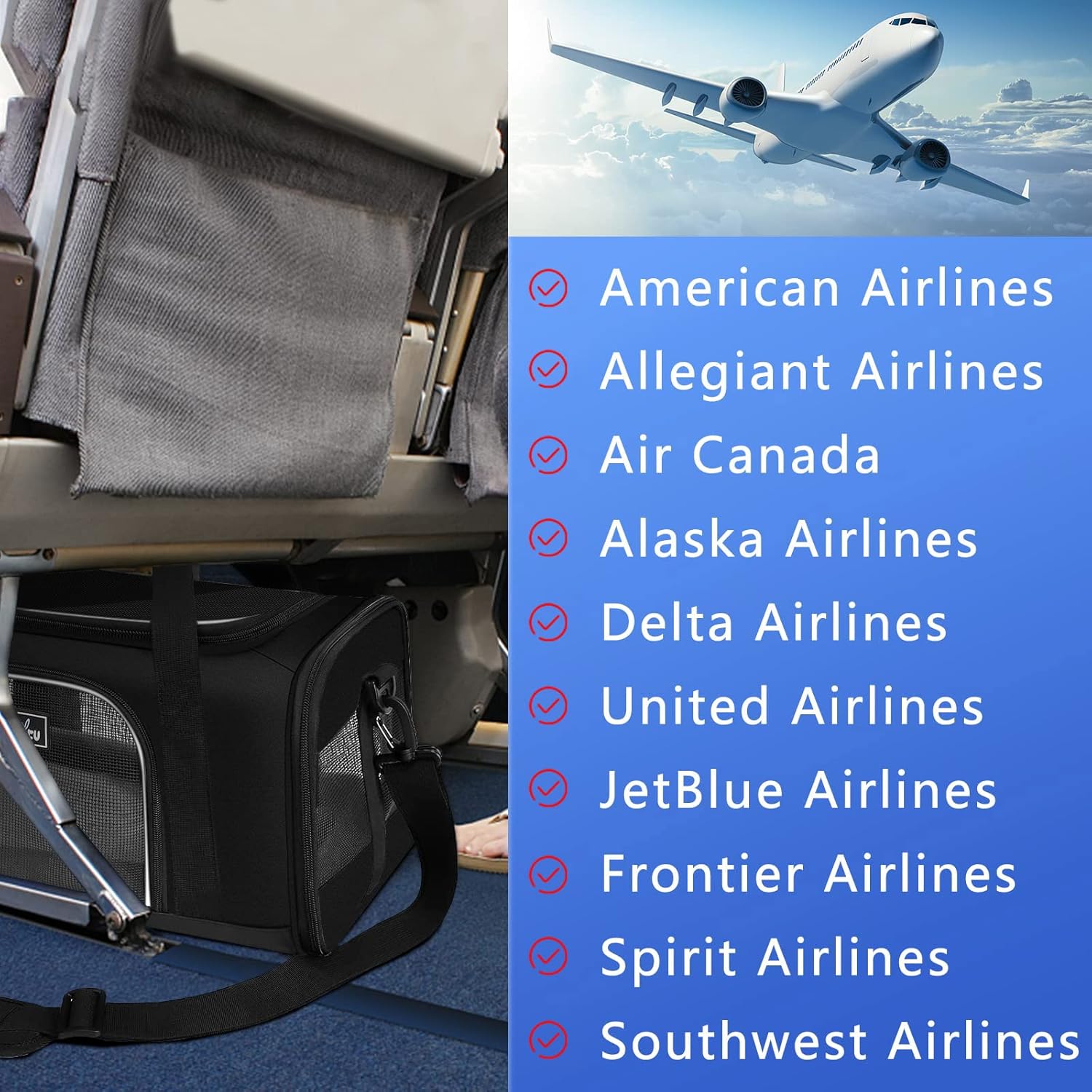 - 🐶【CHECK SIZE BEFORE PURCHASE】In order to match the airline's under-seat size, this carrier can only accommodate small dogs and cats. We recommend that you carry pets that measure 17.7 "long x11" wide x8.3 "high and weigh under 13LB cat or 9LB dog. Please do not only choose the luggage rack based on the weight, but also refer to the length and height of the pet. Maximum size requirements of major airlines for soft-sided pet carriers: ①American Airlines: 19x13x9"②United Airlines: 18x11x11"③Southwest Airlines: 18.5x13.5x8.5"④Alaska Airlines:17x11x11"⑤Air Canada:21.5x15.5x10.5"⑥Delta Air Lines: 21.5x15.5x10.5"
