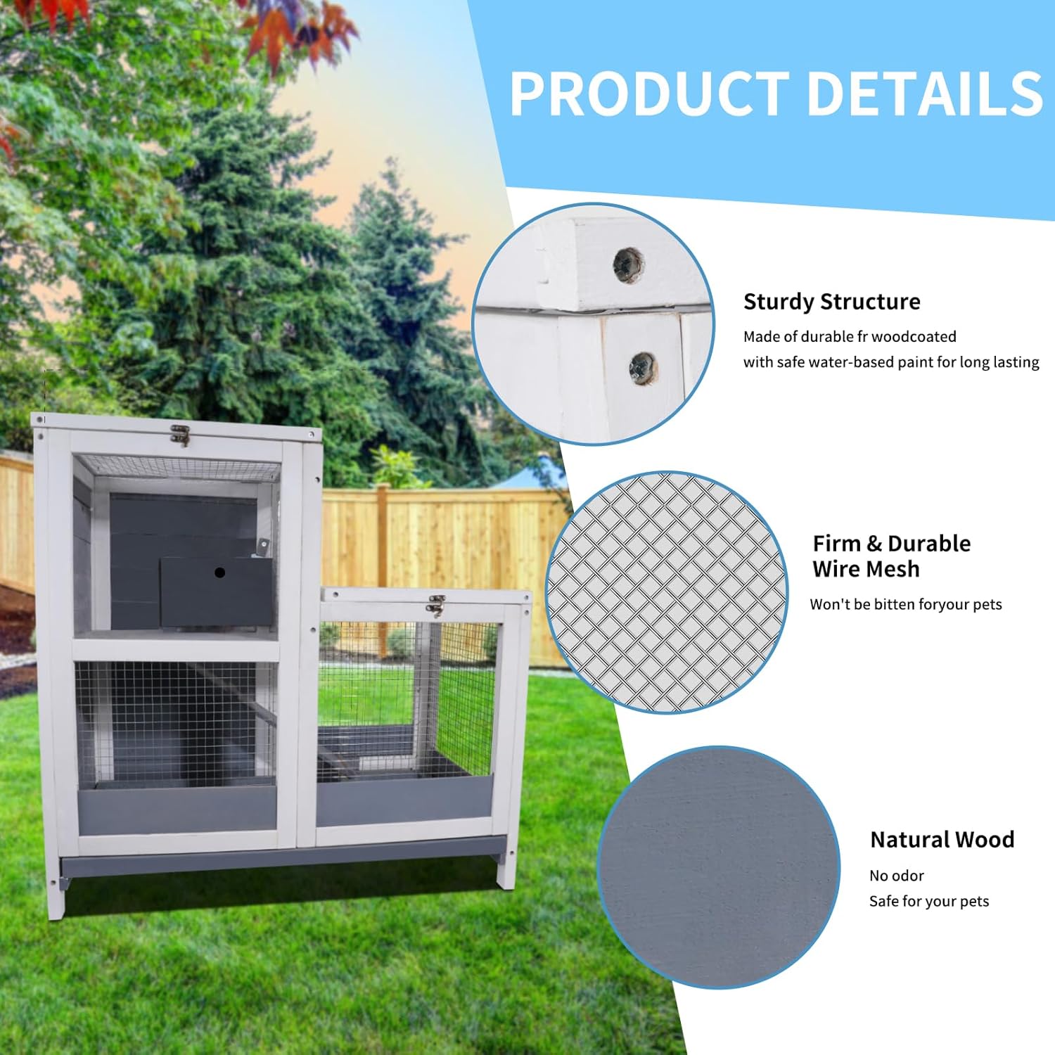 - 【Stable & Durable】100% made of 10mm Finnish spruce panels(NOT CEDAR), with a water-based painting finish, thicker than others guinea pig cages, ensures good sturdiness to use. The wire roof with UV proof panel protect your pets against the sun, rain and snow.