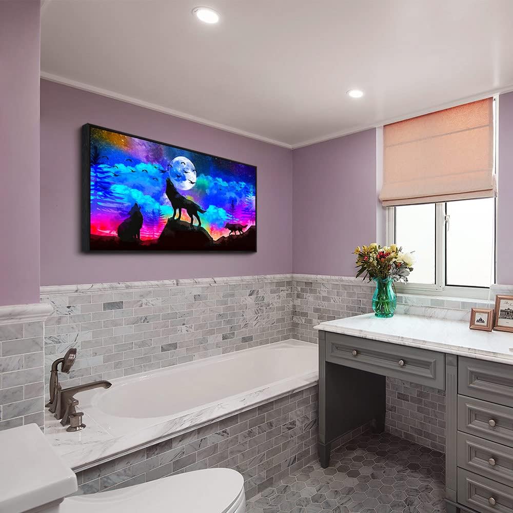 Framed Canvas Wolf Landscape Painting Canvas Wall Art For Living Room Bathroom Wall Decor For Bedroom Kitchen Artwork Canvas Art Prints Modern Office Home Decorations Blue Starry Sky Hang Pictures
