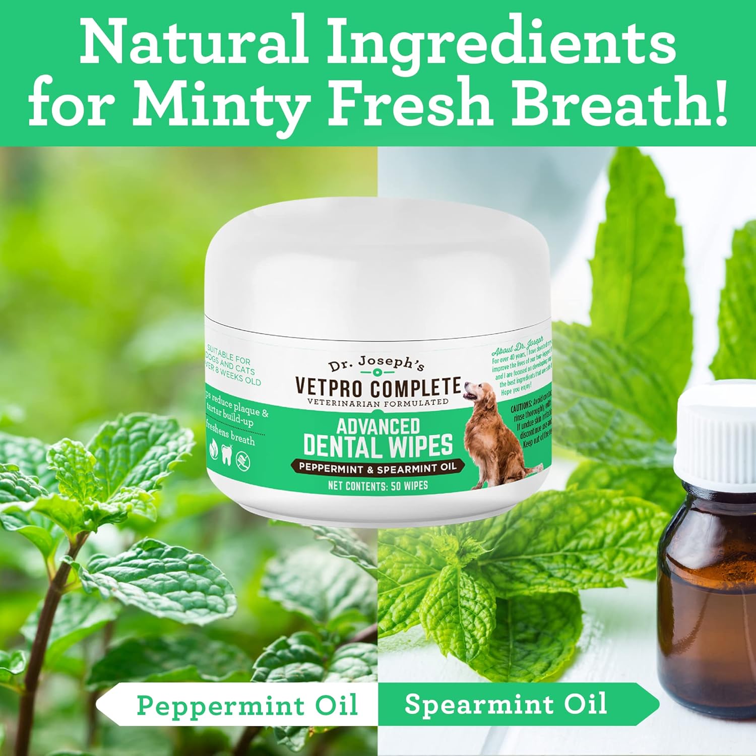 VetPro Complete Dr. Joseph's Advanced Dog Dental Wipes, 50 Count, Easy Teeth Cleaner for Dogs and Cats with Peppermint and Spearmint, Freshens Breath, Reduces Tartar
