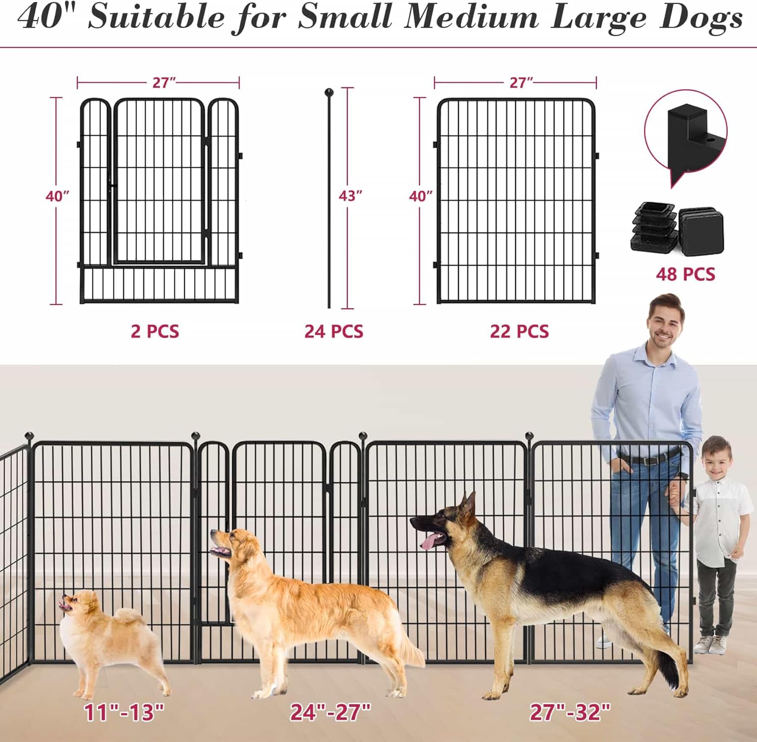 - 【Upgraded Size & Large Space】: Our dog fence outdoor for yard measures 27"W x 40" H, offering a larger comfortable space for your furry friends. With 8-40 panels of different sets, the pet fence provides a maximum space of 669 square feet. Suitable for large/medium/small animals, like Labrador dogs, golden dogs, cats, rabbits, ducks, chickens, and more
