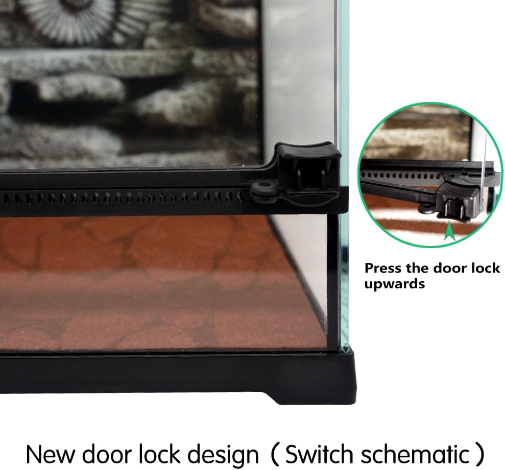 - 【Compact Design Mini Glass Terrarium】: Made of premium thick glass base for extra safety. The front door opens with one hand separately, making this reptile terrarium easy to access and easy to clean, decorate and maintain. Specially designed locks also help prevent escapes