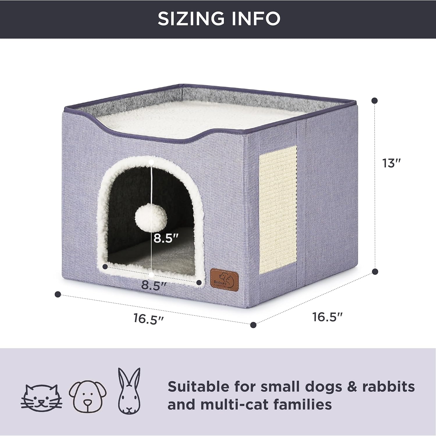 - Spacious Comfort: The cat hideout's bottom compartment measures 16.5 x 16.5 x 13", ensuring a spacious yet cozy den for cats of all ages. The top platform is larger than most brands, providing plenty of room for your cat to stretch out and get cozy.