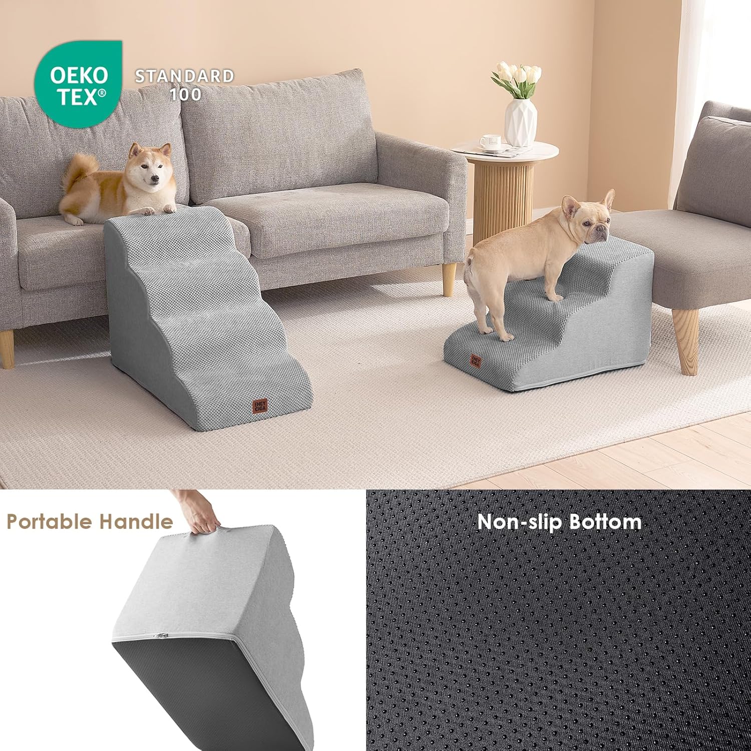 - SPECIFIC AND STEADY DESIGN - 33D density of pure foam make this stair more steady when your pets walk on. The dog bed stairs can provide strong support for pets in the walking process. Low angle slope design can better protect your pet's joints.