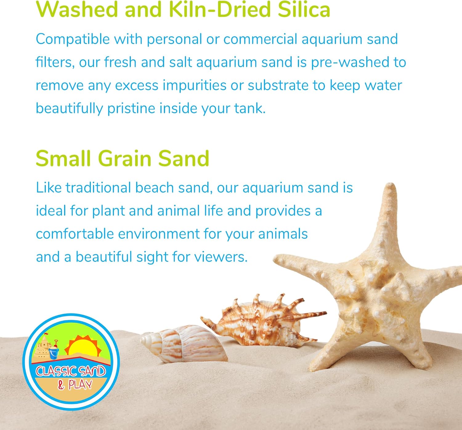 - Washed and Kiln Dried Sand – Compatible with personal or commercial aquarium sand filters our fresh and salt aquarium sand is pre-washed to remove any excess impurities or substrate to keep water beautifully pristine inside your tank.