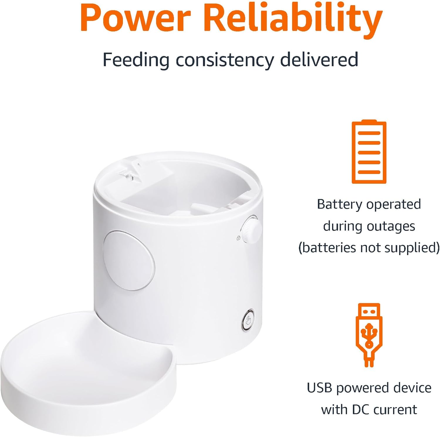 - In case of power outages, the feeder will continue to operate on battery back up for feeding consistency (batteries not included)