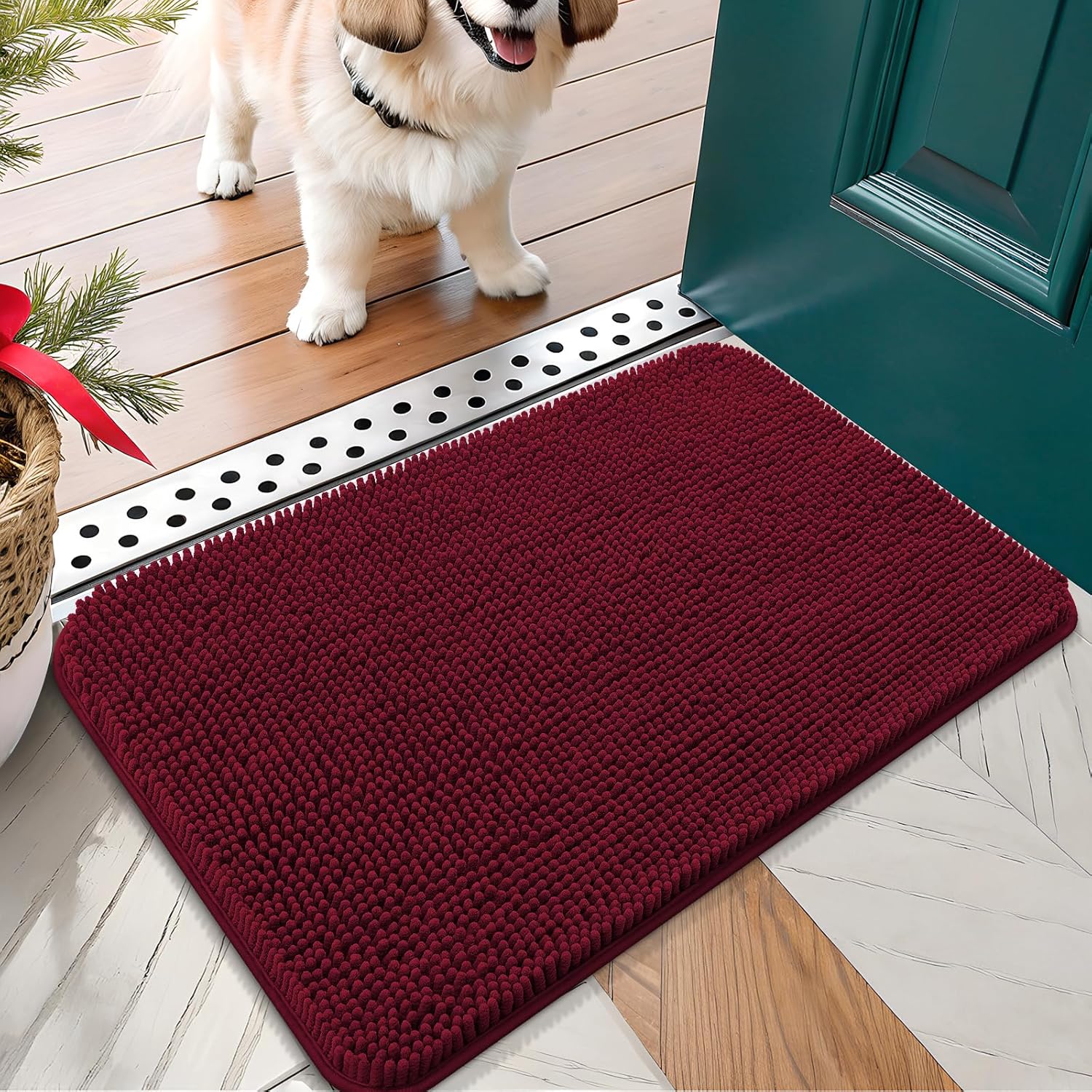 OLANLY Dog Door Mat for Muddy Paws 24x16, Absorbs Moisture and Dirt, Absorbent Non-Slip Washable Doormat, Quick Dry Chenille Mud Mat for Dogs, Entry Indoor Entryway Carpet for Inside Floor, Burgundy