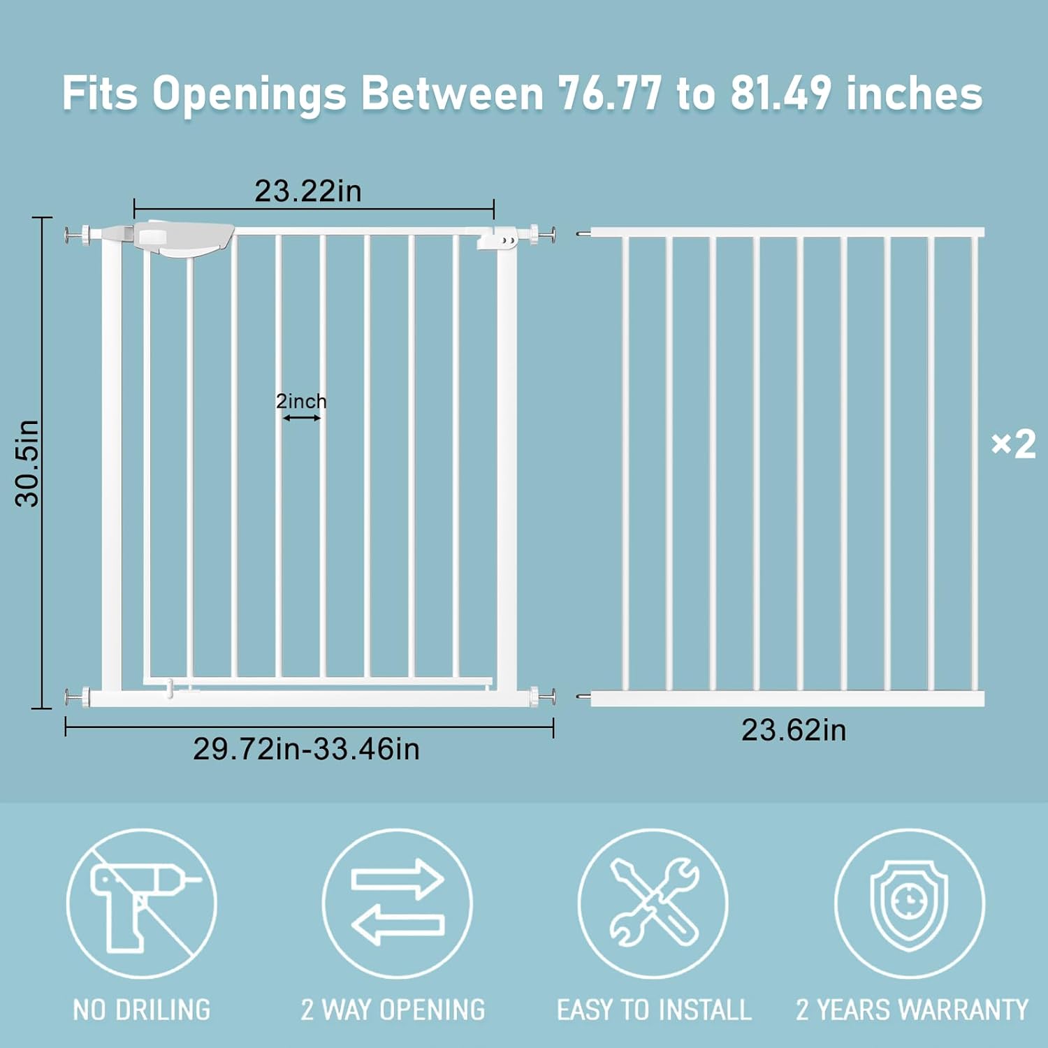 - 【Multi Use】The width of the triple lock extra wide pressure mounted baby gate can be adjusted from 25.59 inches to 81.49 inches so that it is available for stairs, doorways, and other diverse occasions to stop babies or pets to climb over. Tips: before installation, there will be a gap between the wide gate latch and the frame which is NOT a defect and it is NOT bent. This gap will disappear once installed.