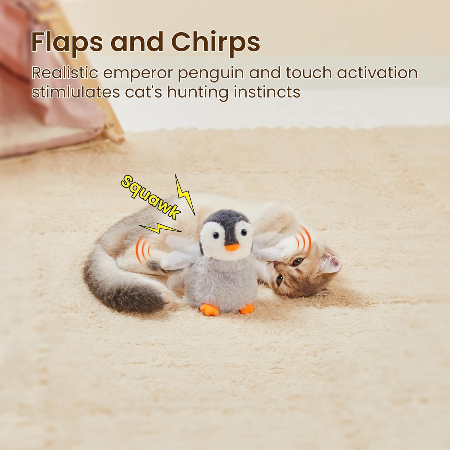 - Realistic Emperor Penguin Simulation: The beating wings cat toy looks like a real emperor penguin, an eye-catcher for cats, keeping your kitty on her paws and engaged in real time, alleviating boredom and loneliness and promoting cat's exercise when you are away from home