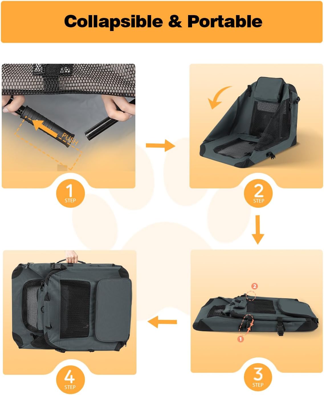 - 【2 Storage Pockets & 2 Portable Handles】The soft sided dog crate has side and top pockets to store essentials such as snacks and toys. The collapsible dog crate is easy to carry with the side handles, making it perfect for travel, transportation and daily walks.