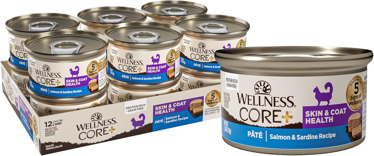 Wellness CORE+ Skin & Coat Pate Adult Wet Cat Food, Natural, Protein-Rich, Grain Free, 2.8 Ounce, 12 Pack (Salmon & Sardine)
