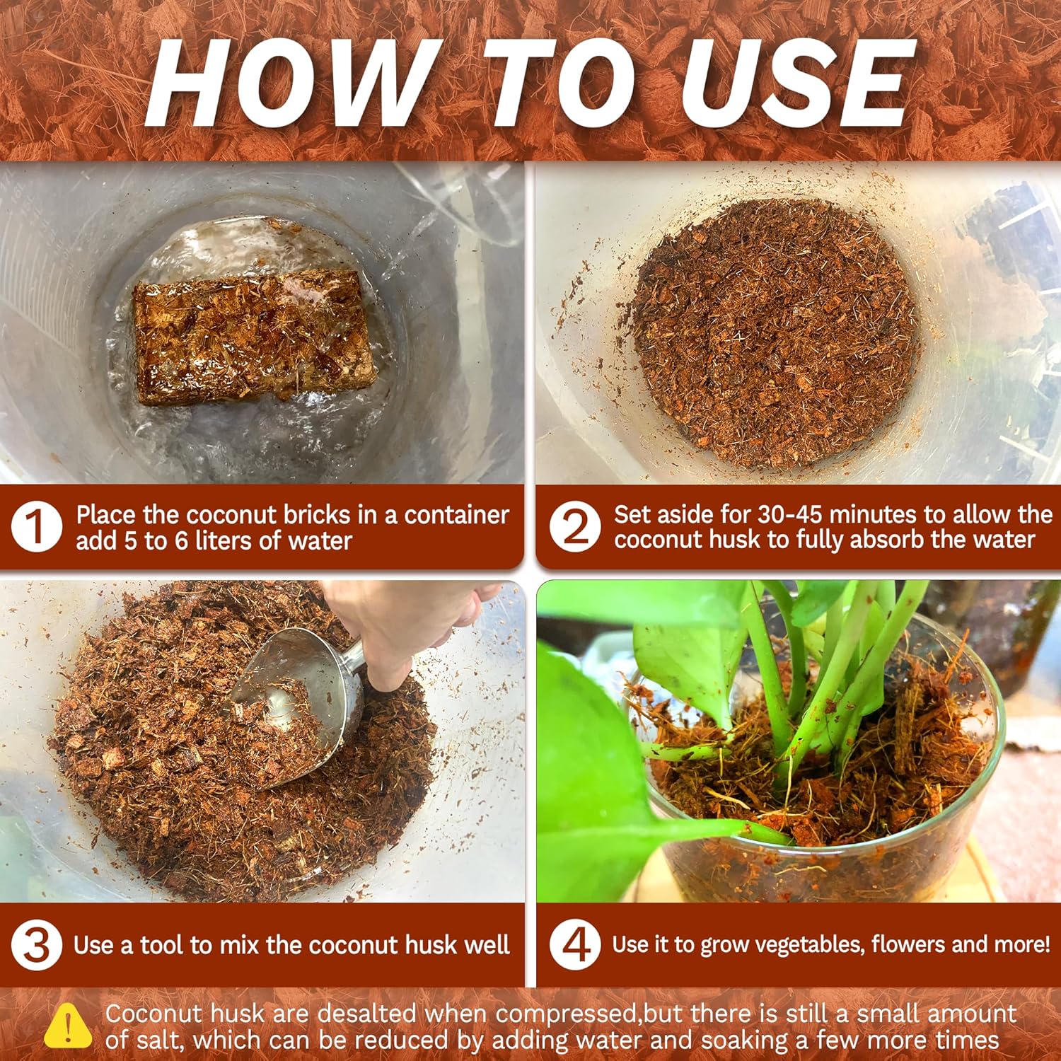 - [100% NATURAL & ORGANIC COCONUT CHIP]: Our coco chips bricks is made from the coconuts husk, which are a natural and sustainable resource. It is providing a natural and eco-friendly growing medium for your plants making coconut husk chips an eco-friendly choice for your gardening needs. As well landscaping, reptile bedding, terrarium bedding, and ground covering.