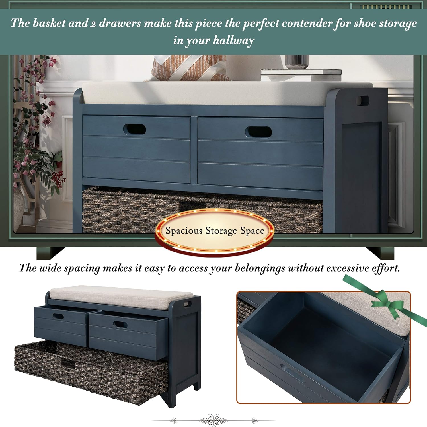 Storage Bench Removable Basket 2 Drawers Fully Assembled Acacia Wood Shoe Bench Standing Shoe Rack Removable Cushion for Living Room, Entrance Hallway, No Assembly Required Navy