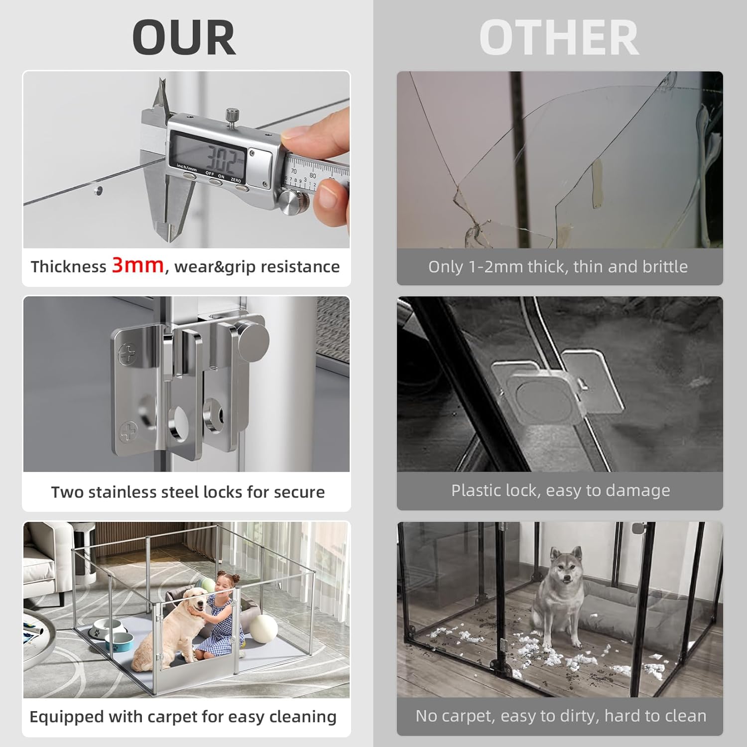 - Clear Acrylic Fence Design - Crystal-clear acrylic dog fence playpen enables you can interact with your pets closely, 360° high transparency and wide vision, it’ll relieve your pets from anxiety, they also make sure you are by their side, equipped with a door for dog mom/ pets to come and go easily, so this is a unique gift for your loved friends, get this fence in the room, instantly improve the overall interiors