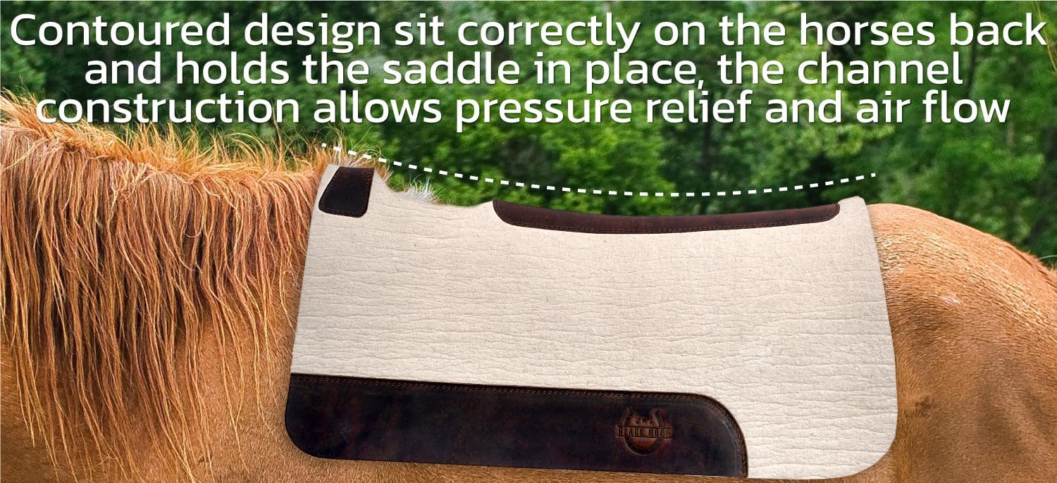 - PREMIUM MERINO WOOL FOR SUPERIOR COMFORT Crafted with 100% steam-pressed Merino wool felt, this saddle pad provides exceptional softness and cushioning. The high-quality wool minimizes pressure points and ensures your horse enjoys maximum comfort during every ride.