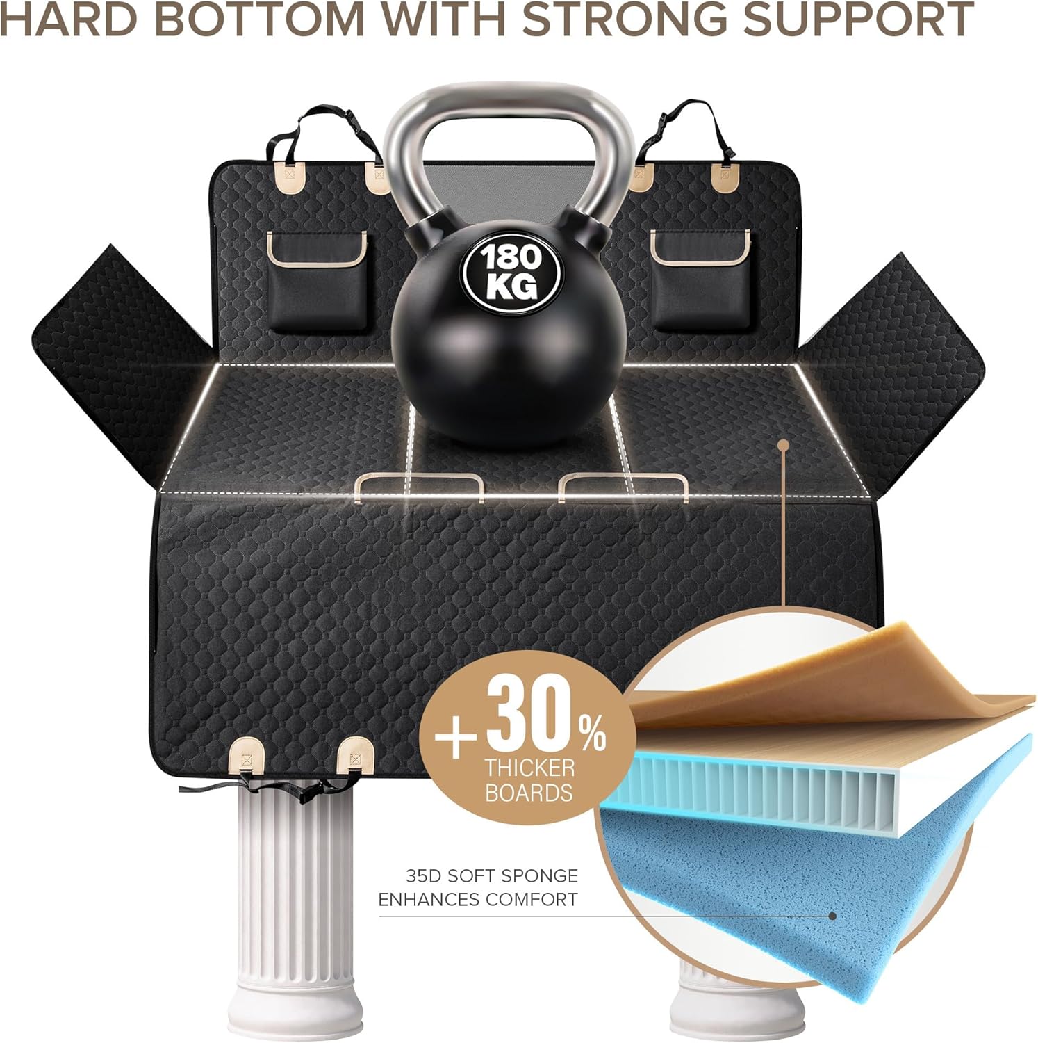 - 7-LAYER MATERIALS FOR STRONG SUPPORT, PROTECT AND COMFORT - Constructed with heavy duty materials including 600D scratch-resistant Oxford, waterproof fabric, thickened hard bottom boards, 35D soft sponge and cotton layers for added comfort and non-slip fabric that wouldn’t slide. Pet seat cover for back seat safeguards trucks from wear, water, and stains, extra-high door protector prevents scratches, allowing dogs to hop in and out joyfully, leaving you with perfectly preserved interio