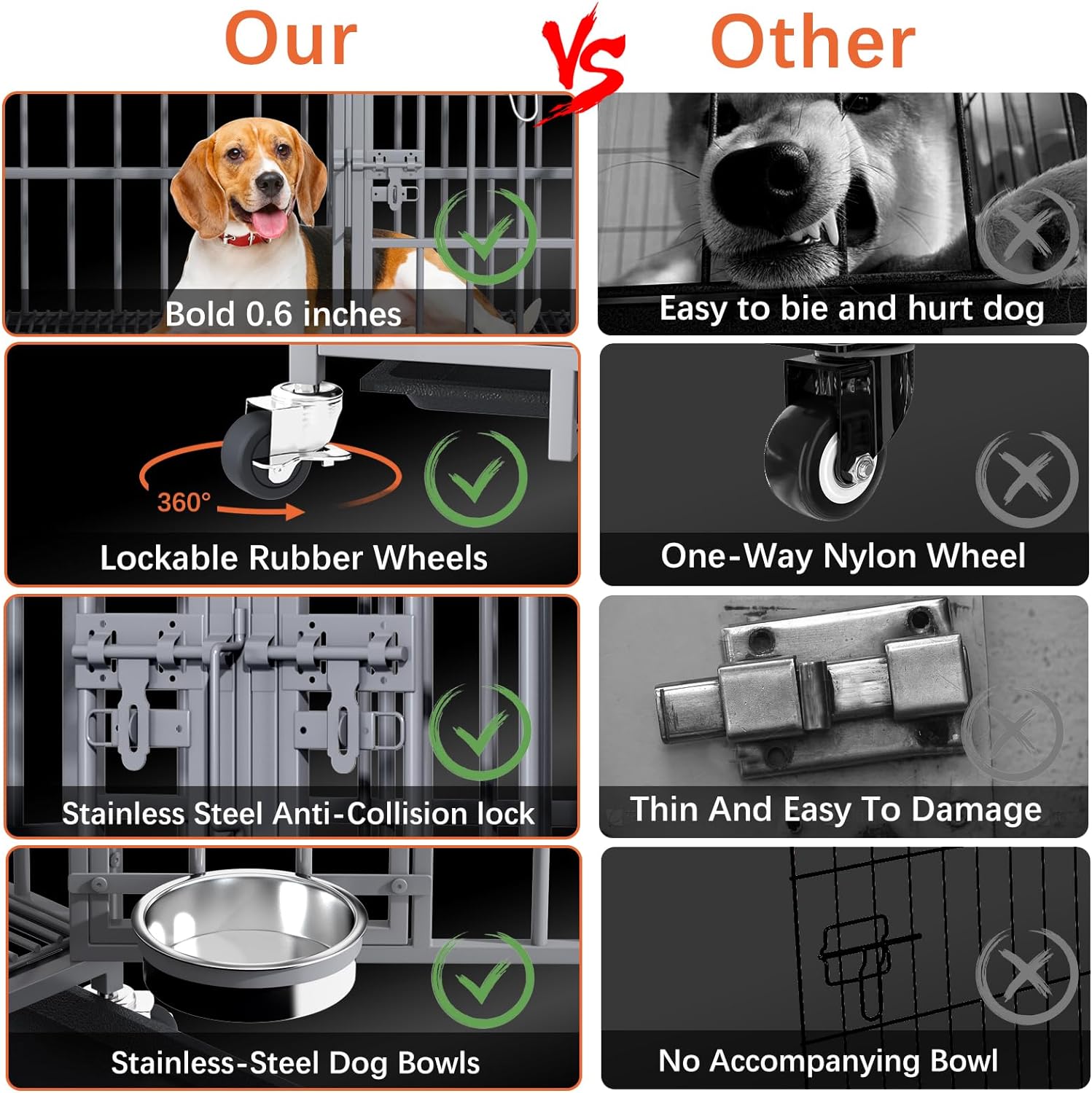 - 【Practical & Easy to Move and Clean】The dog crate comes with four smooth rolling locking wheels for easy movement and fixation, you can easily move the crate to different positions as needed. The dog crate comes with a pull-out tray for easy removal and cleaning. It also comes with a safety latch to avoid your smart dog from opening the iron door, effectively protect your pet.