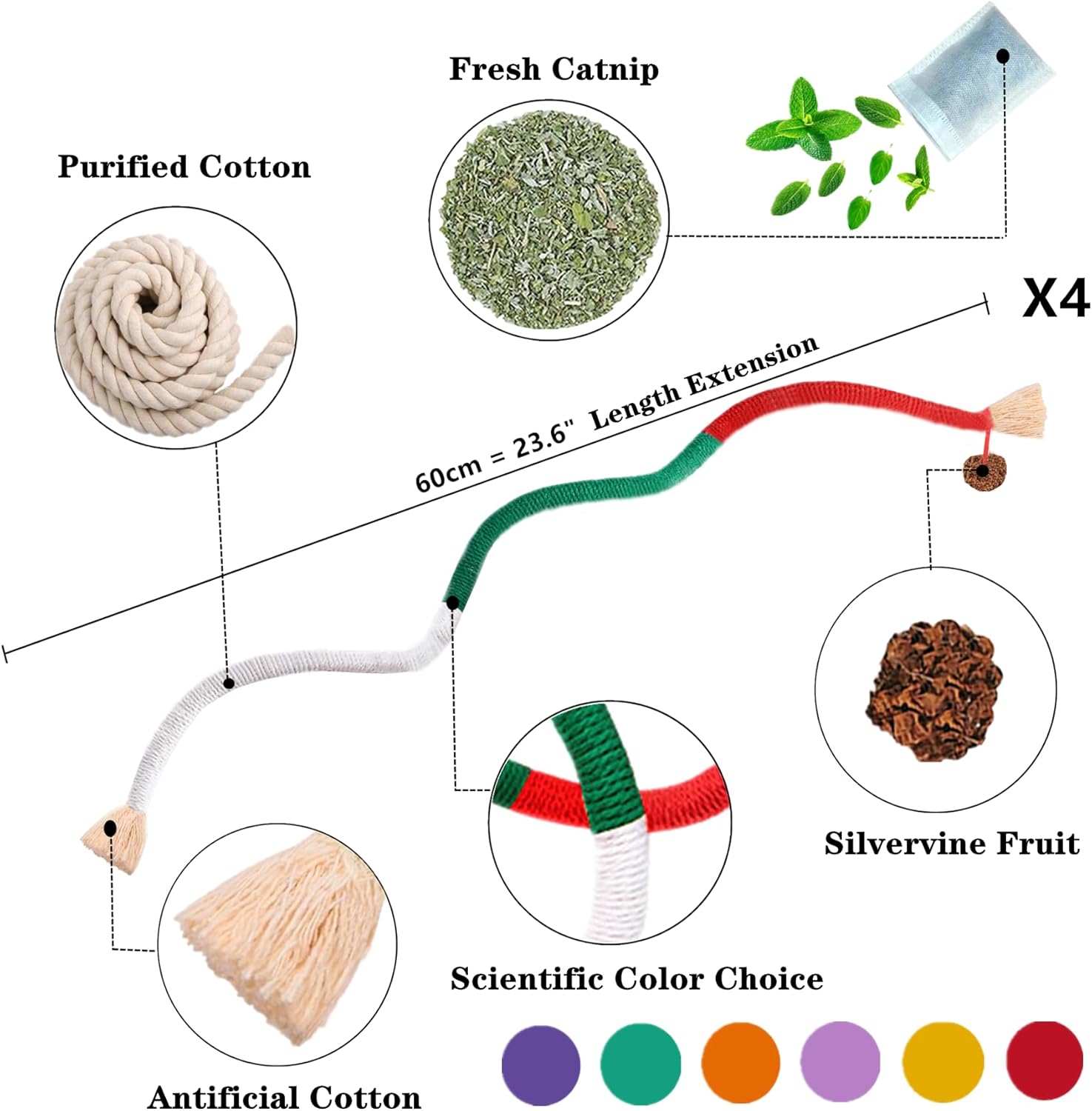 - 1.[Mix-Cat Toys for Meet all Needs]:Package included:1 x catnip bag + 4 x 23.6”Cat catnip rope toys + 3*catnip coating sticks + 3*silvervine fruit coating sticks + 3* silvervine actinidia coating sticks + 2*cat silvervine with lafite grass + 2*cat silvervine with black feather + 2*cat silvervine with yellow feather + 2* cat silvervine with colorful feather.Cat chew toys for indoor cats is suitable for cats of all ages & breeds, relaxation for every stage of life. No wire inside, safe to use