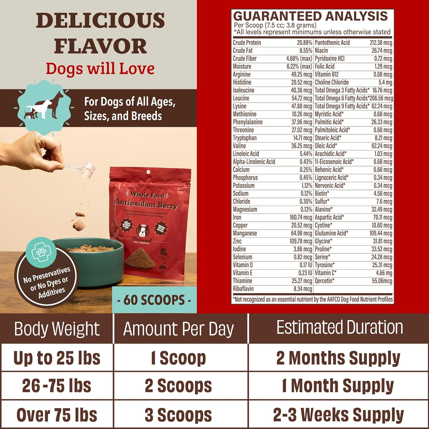 - POWERFUL ANTIOXIDANT FOR A HEALTHIER DOG: Is your dog not getting the full benefits from their daily meals? Transform their meals with our Antioxidant Berry Granules, a nutrient-dense dog food topper that fights free radicals, supporting your dog's overall well-being. Go beyond generic with a topper that provides superior nutrition, helping your dog live a vibrant, active life.