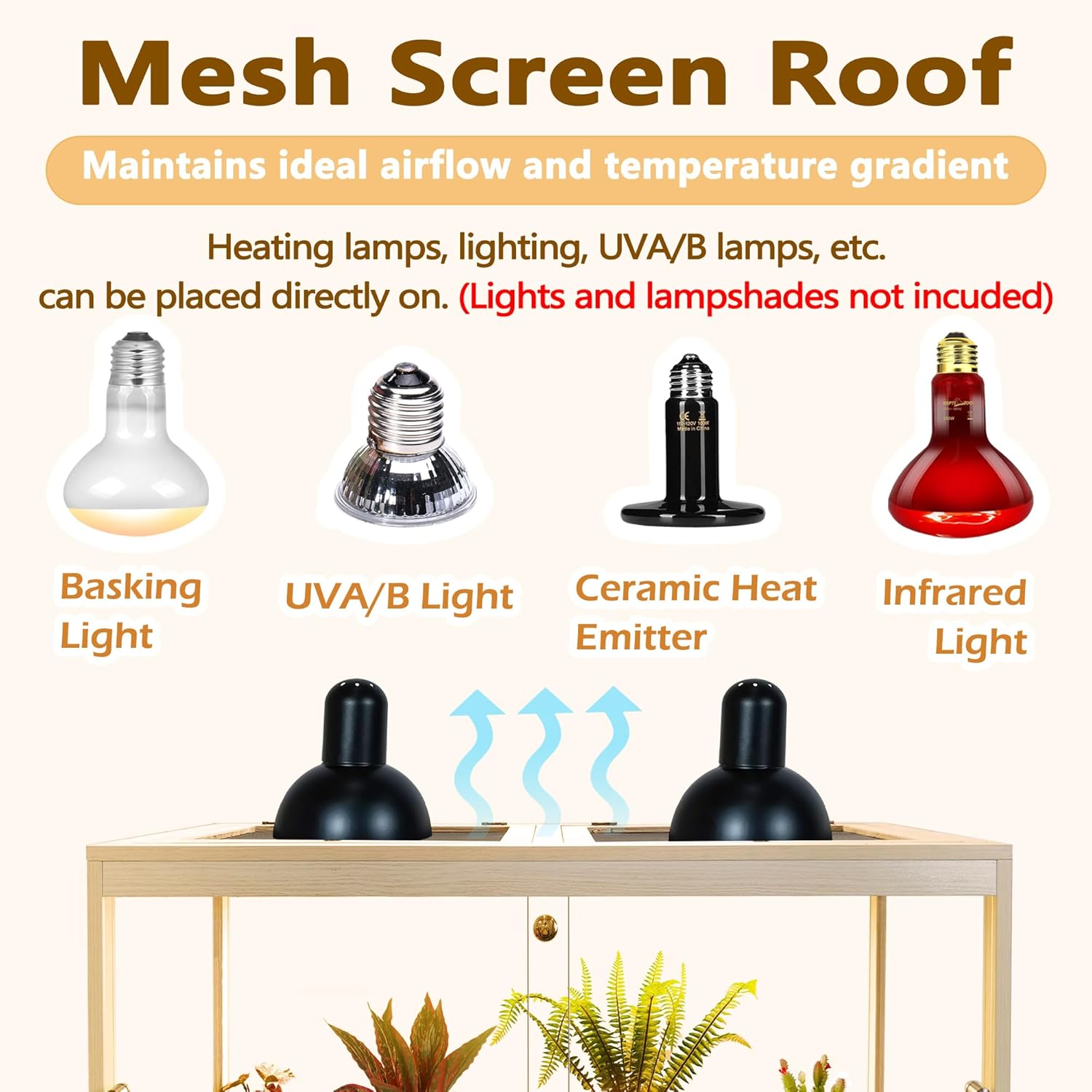 - 【Functional Elegance】Designed with functionality in mind, our reptile terrarium features double sliding front doors that can be effortlessly opened or secured with a lock to prevent escape attempts. The top is fitted with sturdy metal mesh, allowing for proper ventilation and accommodating the direct placement of heat lamps and UVA/B lights (not included) to ensure optimal temperature regulation.