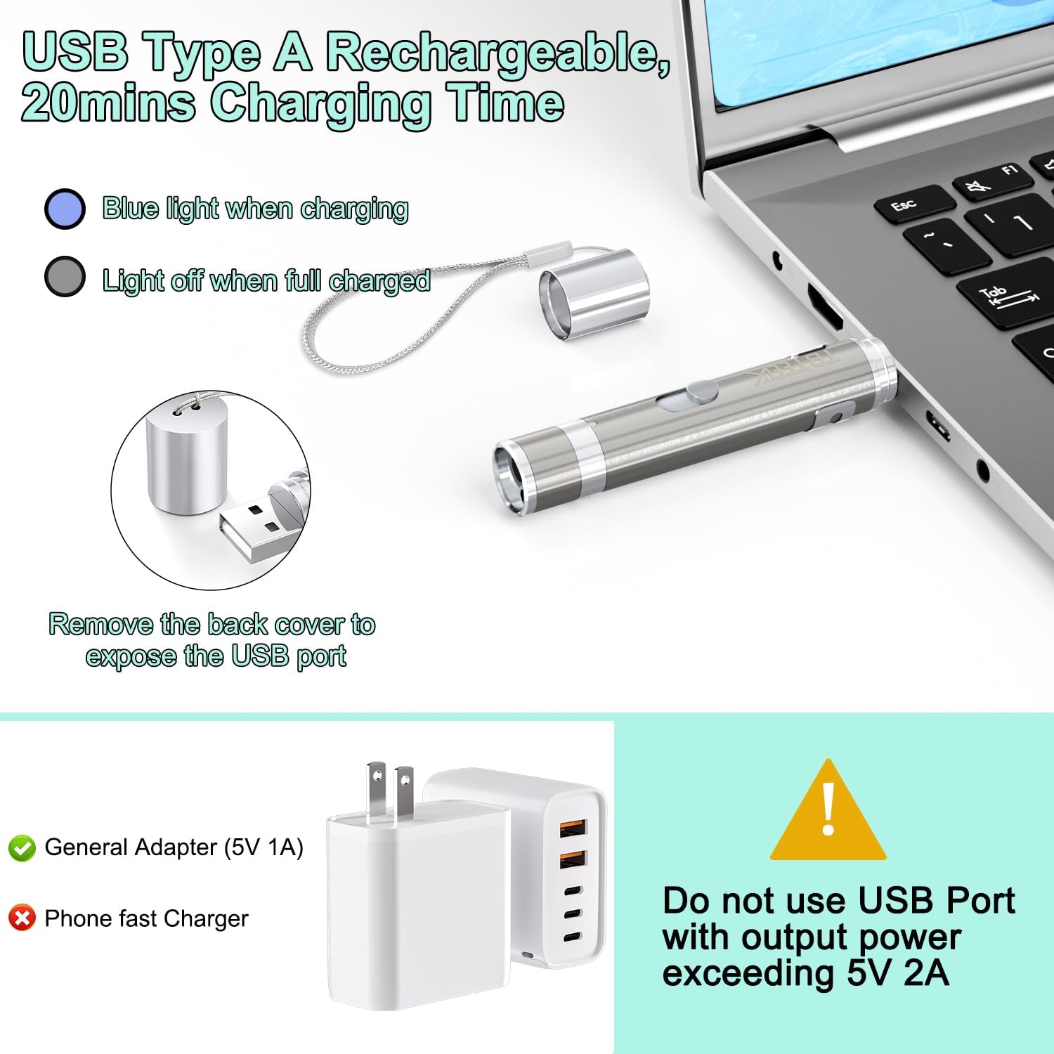 - USB Direct Charging: No dry batteries needed! Unplug the back cover and plug into USB port (adapter/computer/car) to charge, about 20mins fully charged.