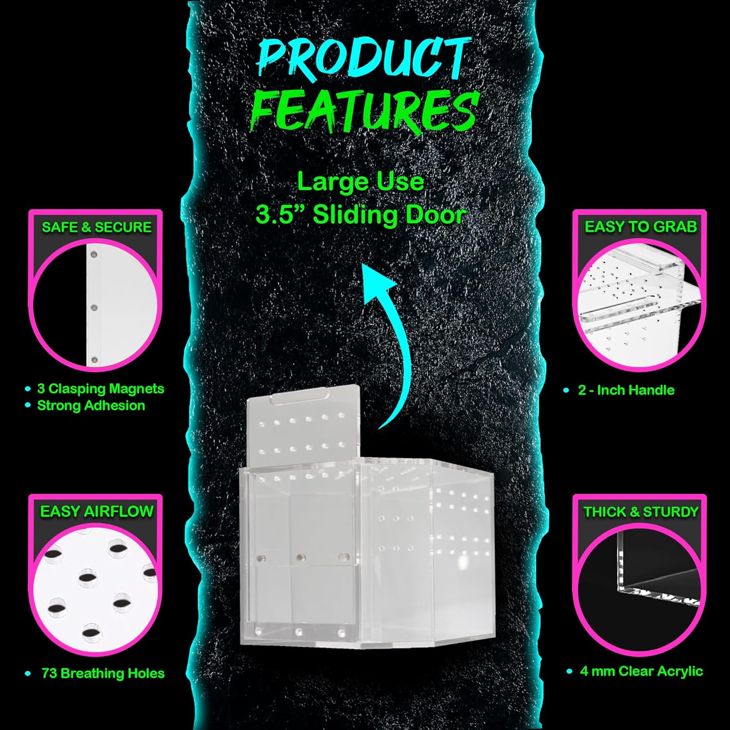 - Acrylic Reptile Enclosure: Our terrariums are a crystal clear acrylic box made for 360 degree viewing, offering 4mm thick acrylic walls, making them sturdy. These reptile tanks come equipped with a 3.5” sliding magnetic door and a 2” handle for easy handling along with 3mm holes for ventilation and air circulation.