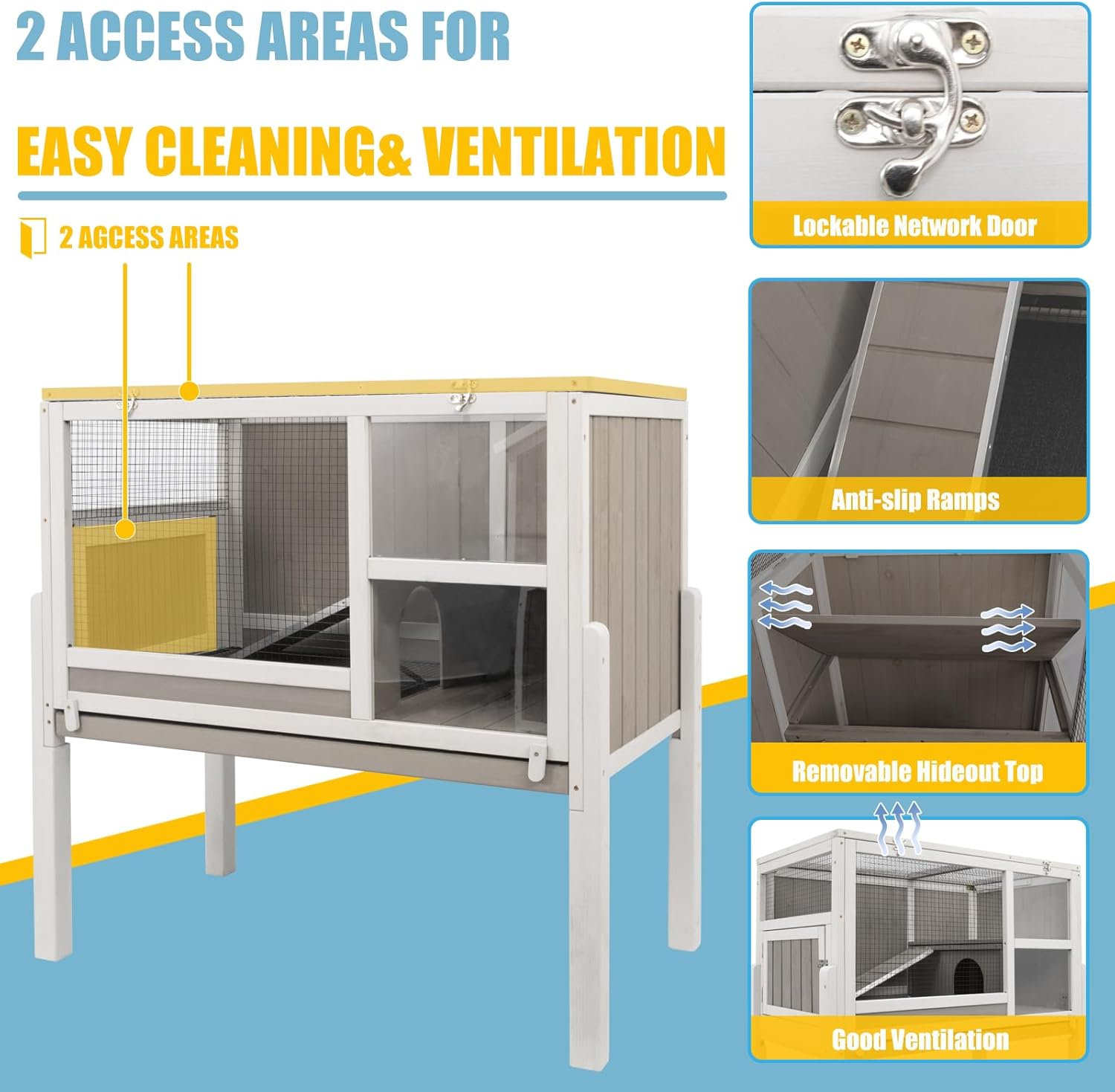 - 🐹【Reversible Cooling Panel】The bunny house features a reversible cooling panel to ensure your pets' comfort during hot weather. It can be flipped to provide extra insulation during colder months. The secure, lockable door on these guinea pig and bunny cages ensures your pets' safety at all times. Easily accessible for all your pet housing needs.