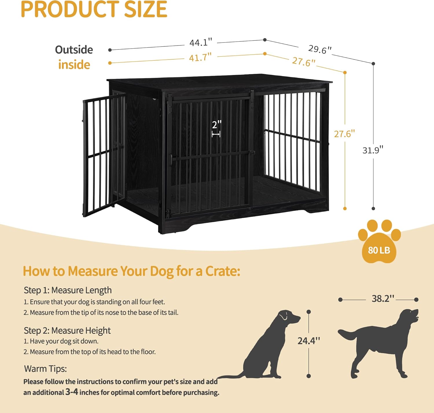 XL Large Dog Crate Furniture, 44.1" Indoor Dog Kennel Furniture with Barn Door, Wooden Tall Dog Crate, Heavy Duty Dog Cage for Large Dogs, Side End Table, Anti-Chew, Black DFC80104B