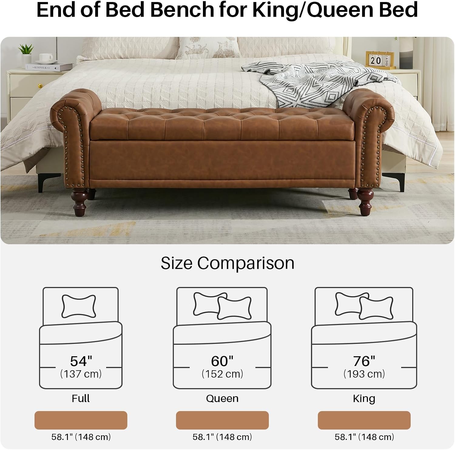 58.1'' Storage Bench Upholstered PU Leather End of Bedroom Bed Bench Ottoman with Tufted Cushioned Rolled Arm Large Storage Space for Reading Living Room Entryway, Brown