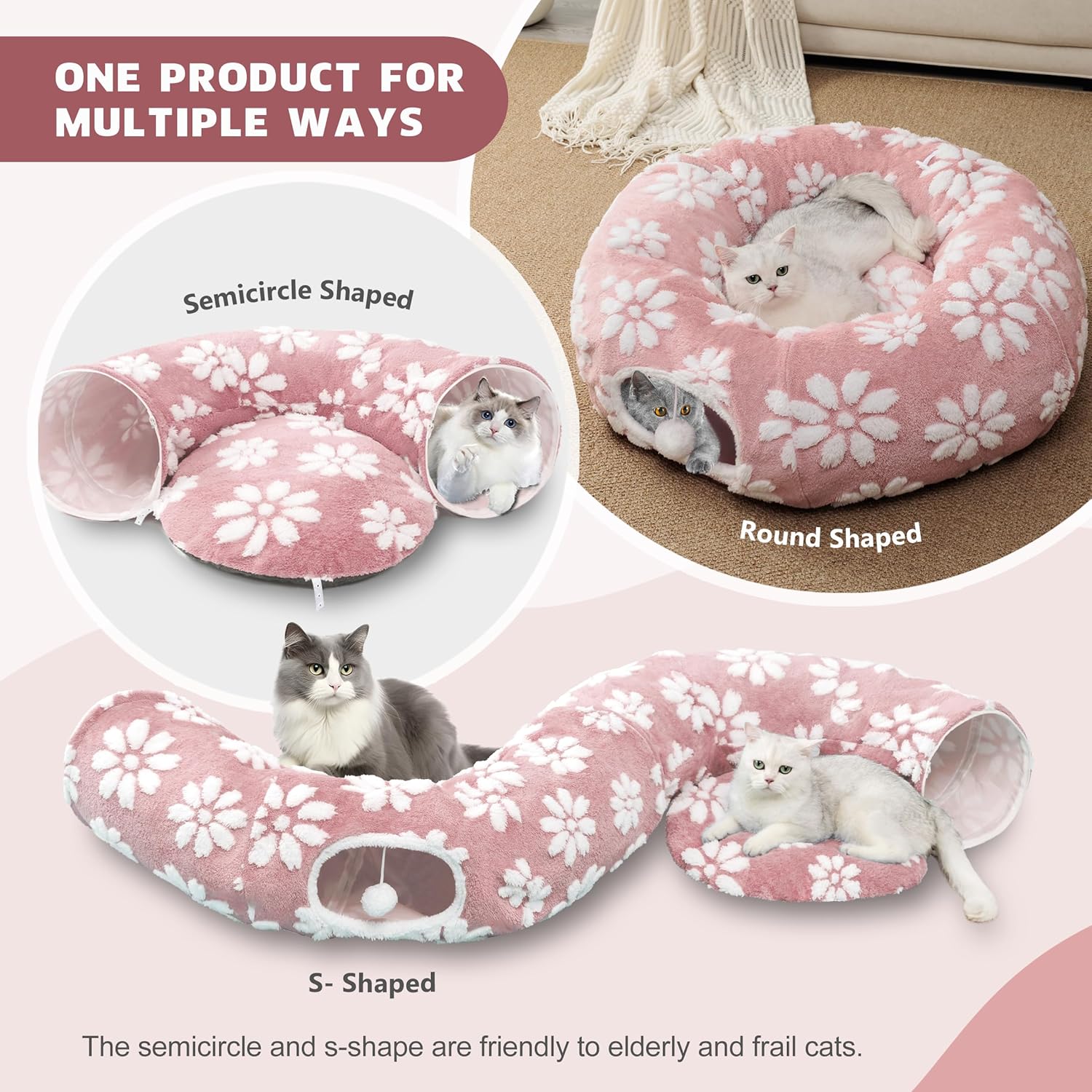 - Easy to Assemble and Care: The design of this donut cat tunnel bed takes into account your convenience, making it easy to assemble and quick to store. The inner cushion bed is removeable, hand washable and easy to clean. In addition, the non-slip bottom keeps the tunnel safe in space, creating a stable and comfortable environment to your pets to play and rest