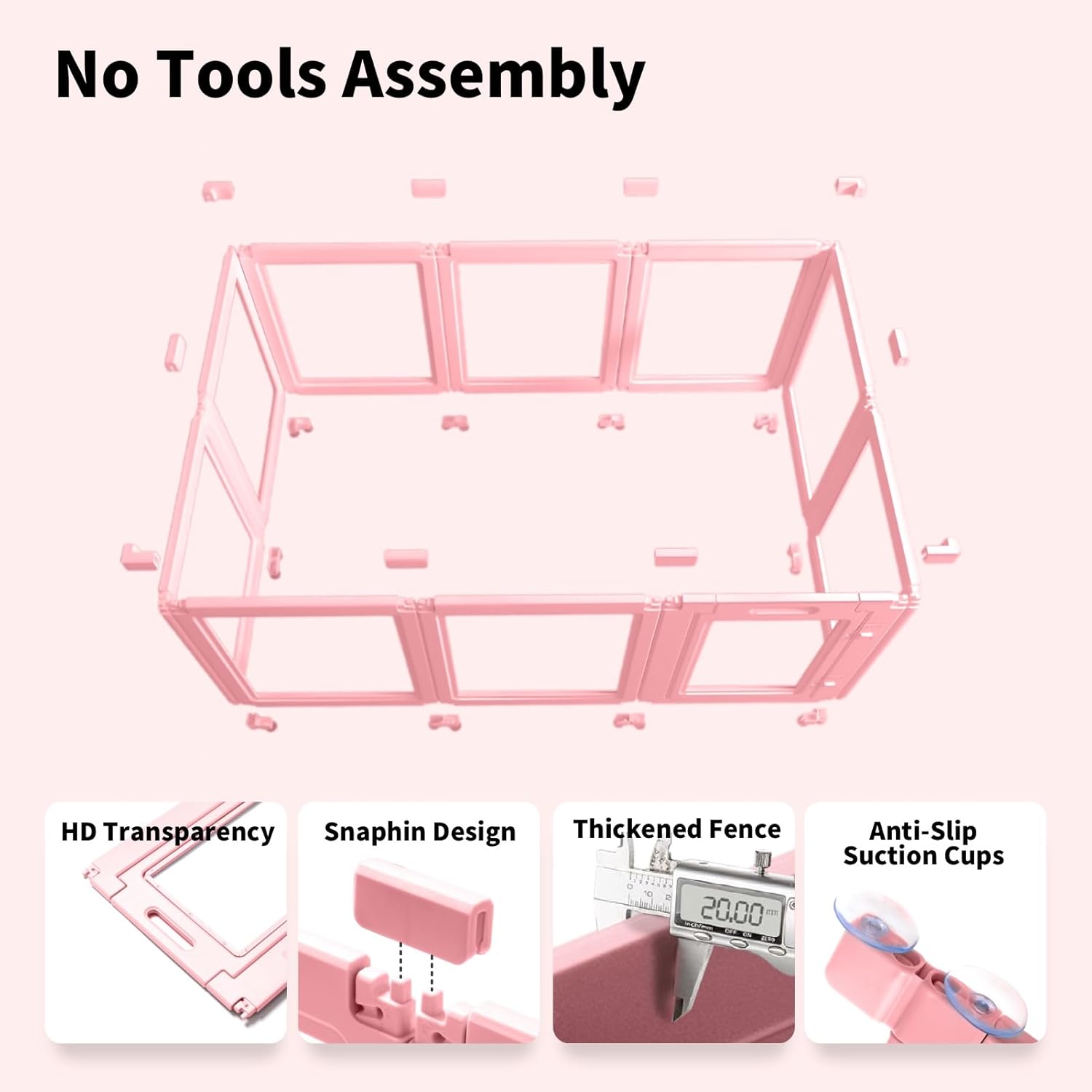 - EASY TO ASSEMBLE & DISASSEMBLE:Our dog fences indoor can be combined into square or rectangular shapes as you idea. Modular assembly design eliminates various of screws and bolts, so no tools are needed, just gentle tap by hand, you can complete the assembly/disassembly in a few minutes, so it's also PORTABLE, you can bring our fence with you when camping or short trips, let your pet to the beauty of life together!